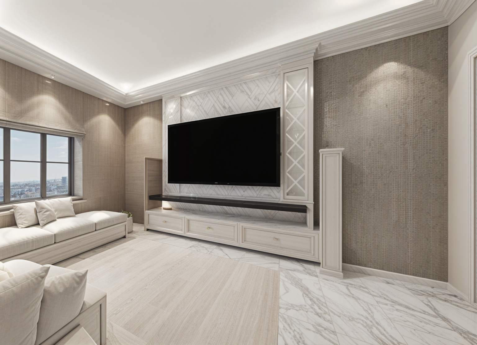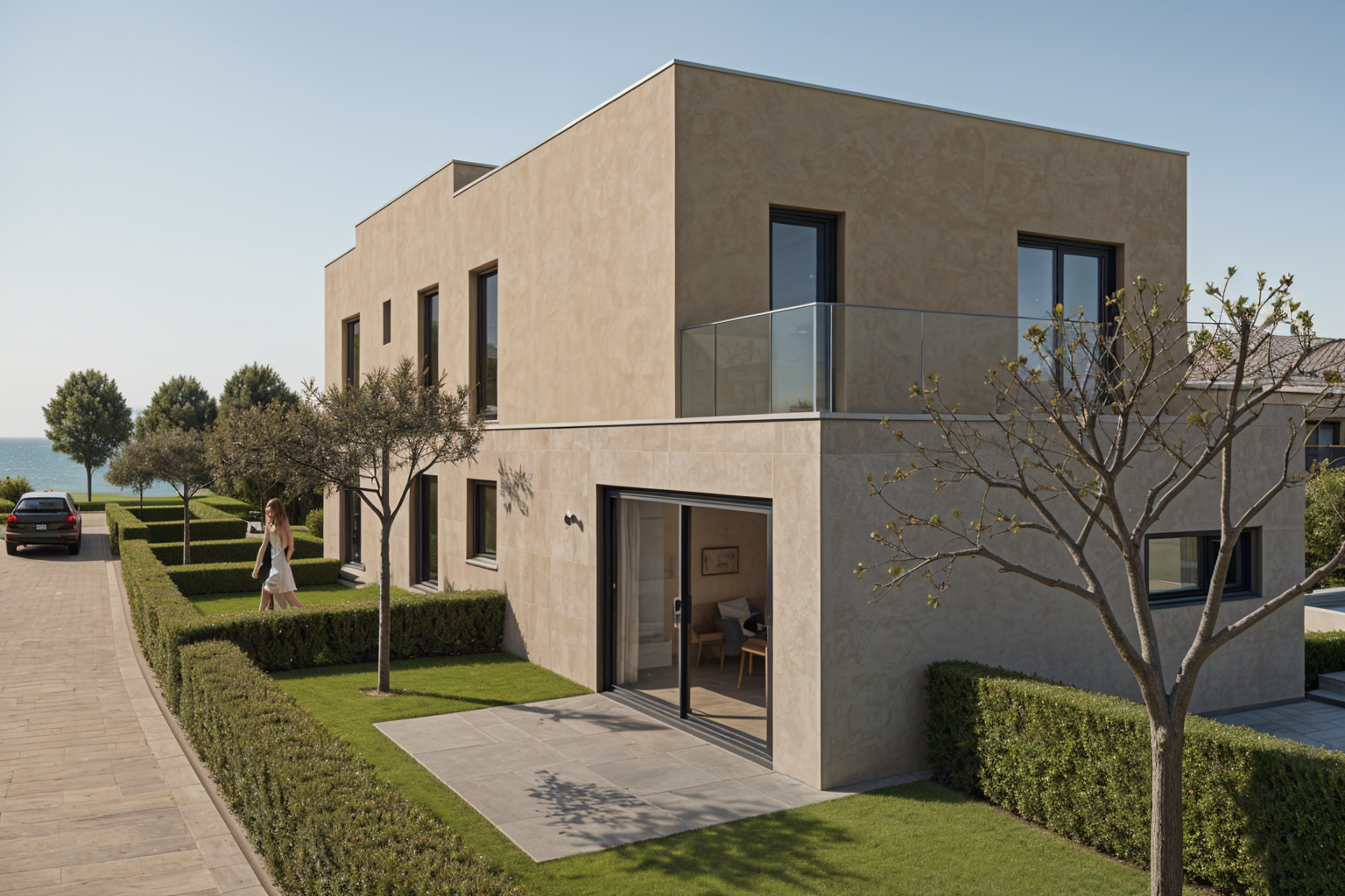 a modern laundry door made of warm natural wood matching the texture of the reference image the walls and floor are finished in smooth microcement microbeton creating a seamless minimalist surface integrated wooden angled slatted doors