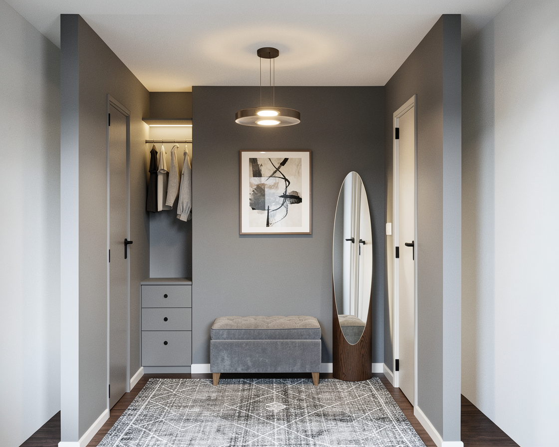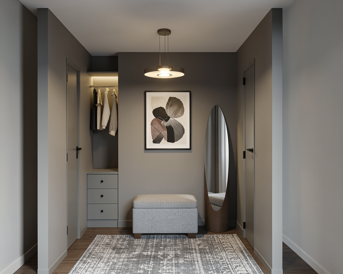 render a luxurious open plan living room and dining area with floor to ceiling windows showcasing a scenic mountain view the atmosphere is warm and inviting with natural light streaming in use a palette of earthy tones including rich brown wood floors and cabinetry the living room features sleek modern furniture in soft grays and beige with vibrant green accents from the dining chairs incorporate a large intricate beige and gold patterned rug elegant pendant lighting and lush green plants capture the essence of a sophisticated airy space with a seamless indoor outdoor connection