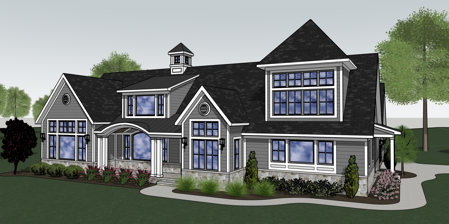 partly cloudy sky some deciduous trees in background add gutters white windows gray siding