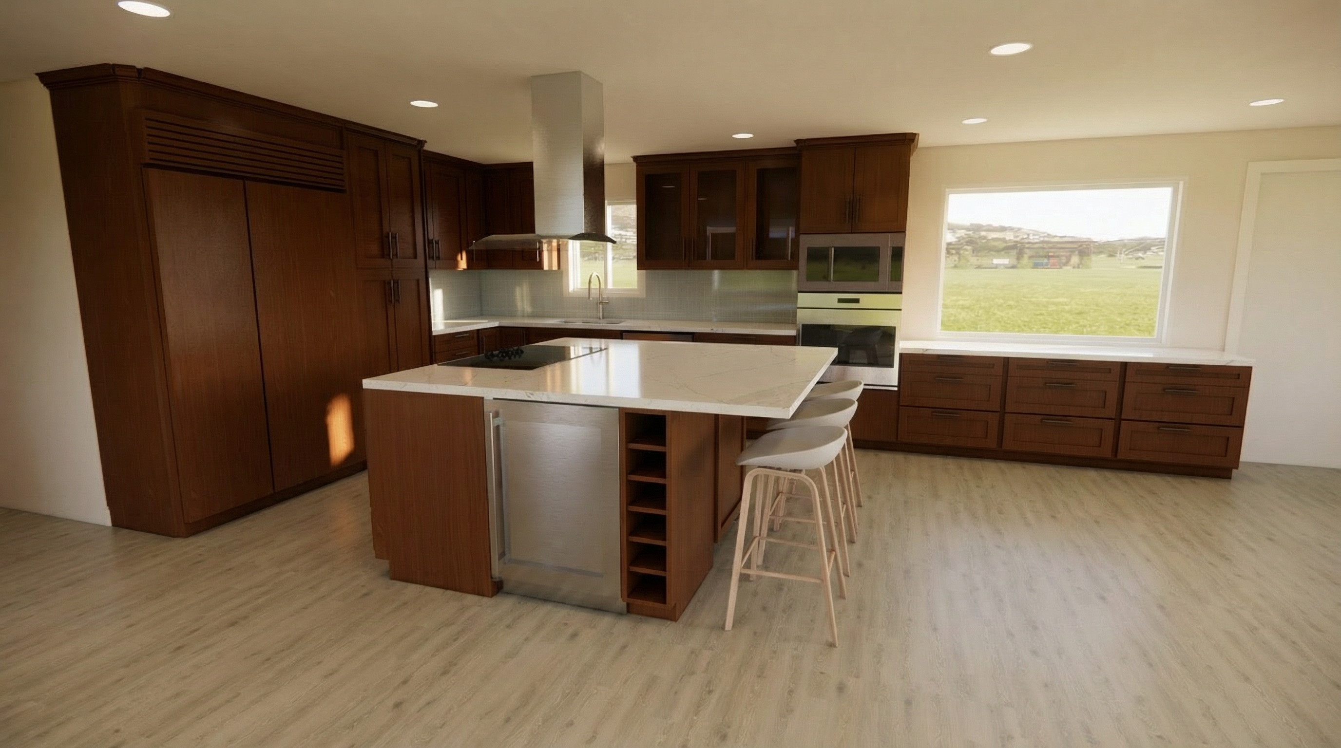 maintain light wood tone add warm lighting do not alter structure of room or cabinets or appliances