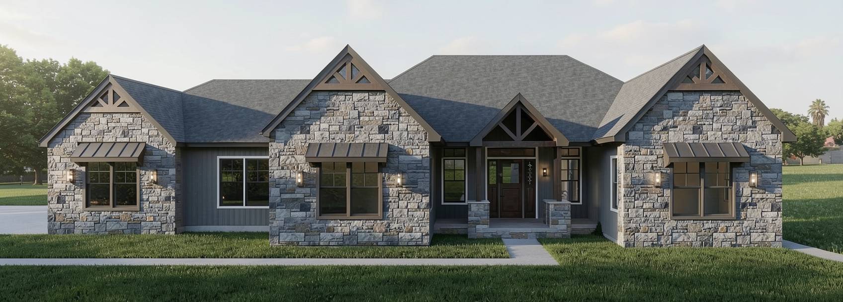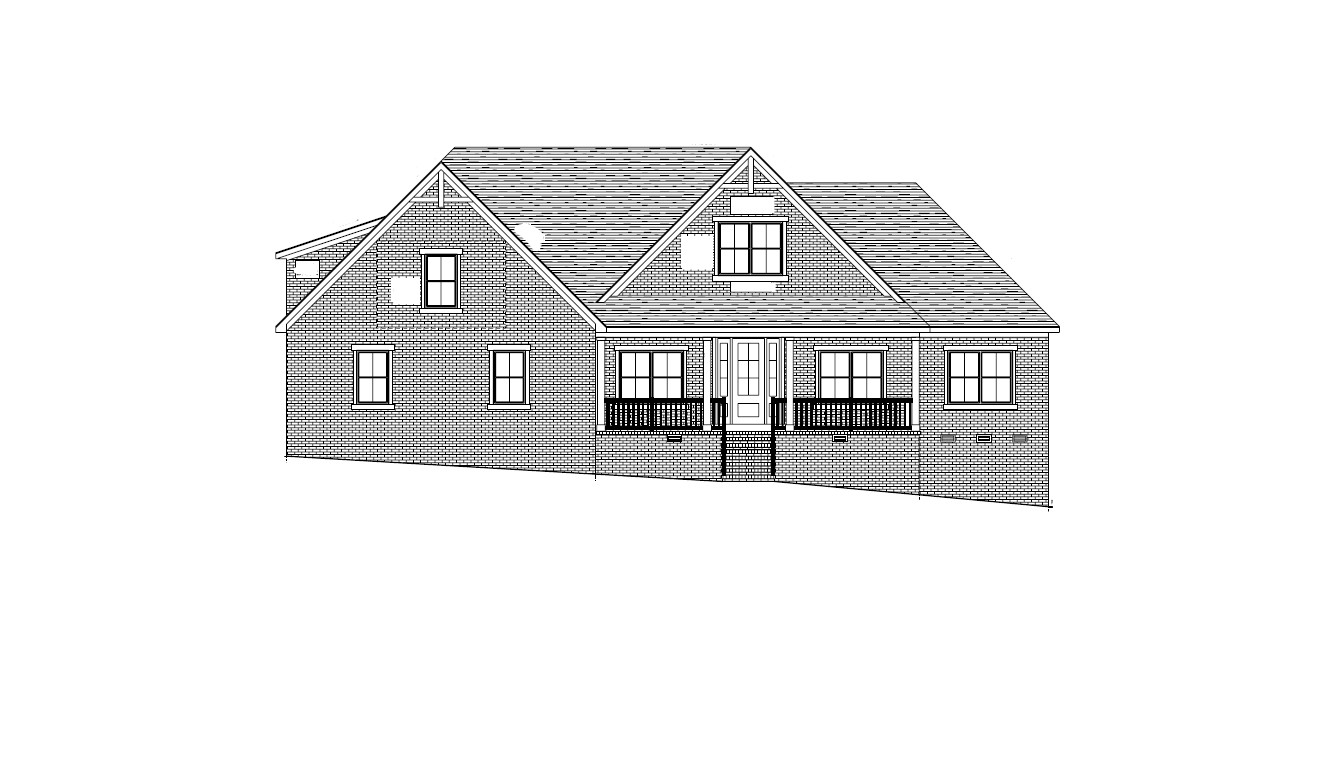 make a front elevation photorealistic as possible while keeping textures the same as shown lightly landscaped on a wooded lot of ridgeway sc nice lighting around 3pm remove any text use the following finishes south hampton brick with gray mortar black windows black certainteed dimensional shingles 4a433d 8 ft 3 4 glass fiberglass front door with white sidelites 463328 posts