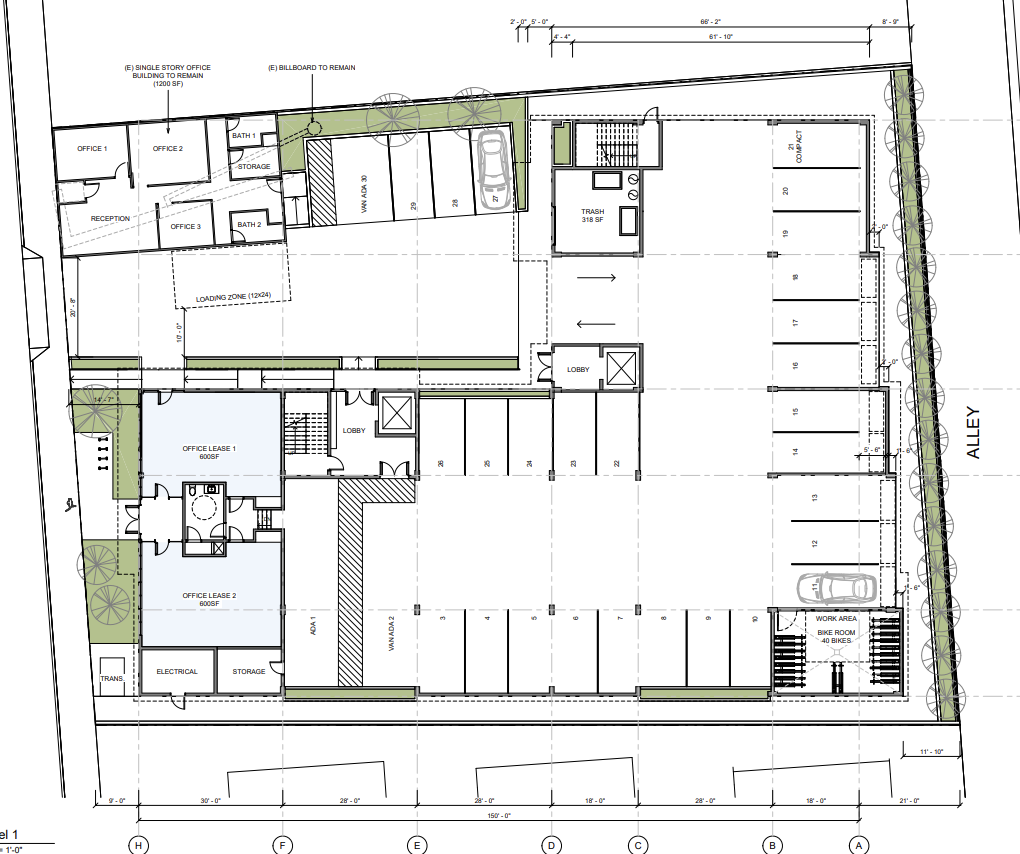 convert this floor plan into a realistic isometric 3d view of a full house show the space from an elevated angle with furniture walls and details visible this is a first floor residence ignore the dimensions dimension lines tags viewports and revision clouds do not keep the room names add residential furniture and environment render from the center with exterior walls gradually transitioning into the drawing bending very seamlessly it s a one floor commercial building so no stairs do not add people only furniture arrange the rooms based on the room names and fixtures using the same furniture shown on the plan do not change the orientation of the floor plan and maintain straight walls without any curves the offices are located on the left side of the lot with the rest of the area designated for parking and bike parking