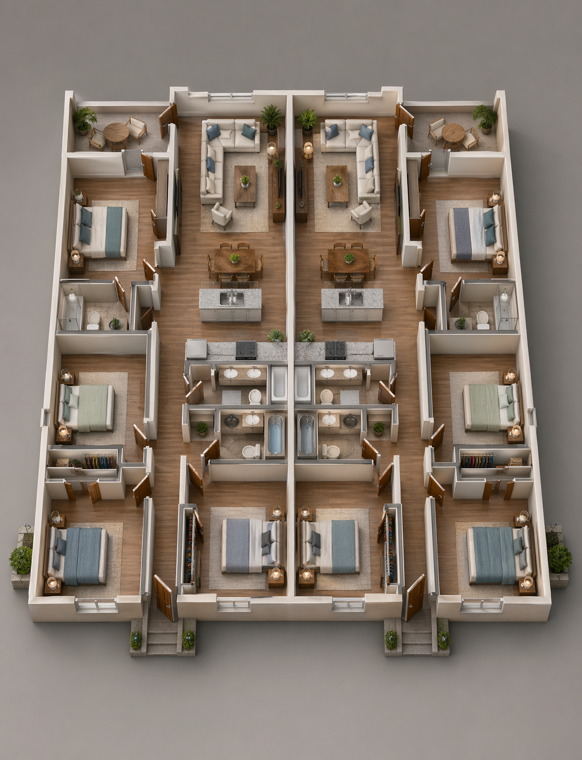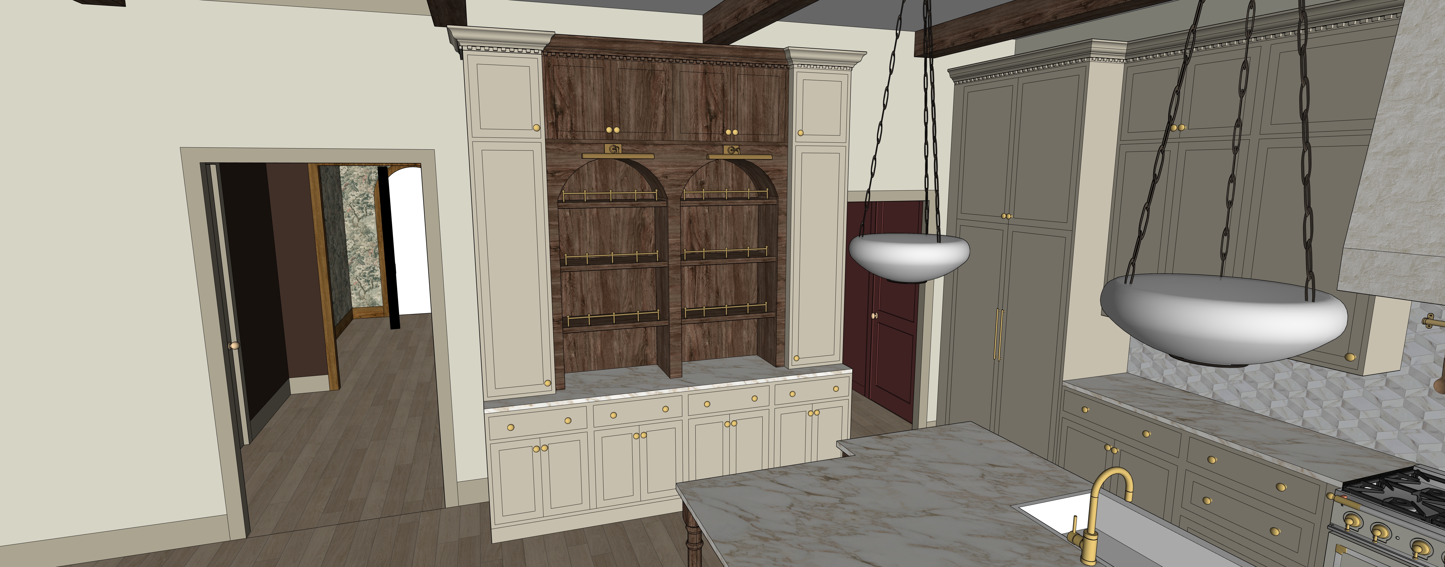create a highly photorealistic rendering of a traditional kitchen using the provided image as a fixed architectural model maintain all geometry exactly as shown built in cabinet wall island corner perimeter cabinetry lighting fixtures beams and camera perspective must not change this is a final finishes rendering intended to feel like a professionally photographed interior overall mood warm refined and softly moody balanced contrast not flat not dramatic natural timeless and material driven materials wood primary fix warm natural oak with visible grain variation and tonal depth slightly aged softened finish avoid orange or raw tones matte finish built in interior wood arched shelving deeper richer and slightly darker than surrounding wood add shadowing at arch curves shelf undersides vertical panel seams must feel dimensional and collected not flat perimeter cabinetry soft off white warm beige matte finish subtle variation panel to panel deepen shadows in door profiles drawer fronts toe kicks built in cabinet wall primary focus painted cabinetry in warm off white beige interior backing shelving in darker stained wood for contrast aged brass gallery rails with soft patina add depth darker recess behind shelving shadow at arch transitions slight tonal shifts in wood backing this area should feel layered and custom not graphic or flat countertops honed marble soft gray with warm undertones subtle low contrast veining matte finish no shine backsplash hood right side glimpse light tonal tile with minimal contrast keep pattern soft and blended no harsh highlights or strong variation hardware fixtures aged brass muted soft patina no bright reflections lighting critical natural light soft daylight entering from adjacent spaces diffused and even slight brightness falloff across depth interior lighting pendants very soft glow only no hotspots shades remain mostly neutral built in lighting if visible extremely subtle just enough to lift shelves slightly shadows grounding add contact shadows at base cabinetry to floor shelf intersections underside of countertop edges add soft shadow beneath upper cabinets slight darkening in built in recess ensures depth and removes flat rendering effect ceiling beams wood beams deeper and slightly aged matte finish subtle tonal variation and edge shadowing depth contrast foreground pendants island edge slightly darker midground built in cabinetry balanced and detailed background softly lifted color temperature 3000 3500k warm neutral no yellow cast balanced warmth realism boosters ambient occlusion at cabinet seams shelf joints panel edges micro variation wood tone shifts slight paint inconsistency subtle material imperfections slight desaturation 5 10 for realism camera output maintain current perspective eye level 5 ft 28 35mm lens high dynamic range 4k 8k resolution rendering style editorial interior photography soft contrast not flat materials feel tactile and real no glossy or artificial finishes