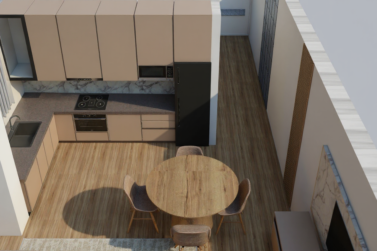 it s a cafeteria with solid wood parquet flooring and a ceiling with pendant lights it needs round white tables and black cabinets with students in the space beyond the windows there s a lively schoolyard