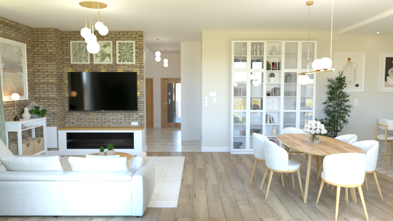 scandinavian interior with a subtle touch of elegance realistic daylight photography two level single family house in warsaw open plan living room and dining area 40 degree sectional perspective eye level camera 35 40mm lens natural proportions no wide angle distortion beige and warm white color palette with soft sage and olive green accents light oak wooden floor with natural grain variation and matte finish light oak wooden doors tv wall finished with warm beige brick thin brick texture slightly irregular surface subtle mortar depth large black flat screen tv centered on the brick wall perfectly horizontal realistic reflections very subtle no mirror effect simple white low tv cabinet with clean lines and soft shadow gap below light upholstered sofa in warm off white fabric visible fine weave texture soft cushions slightly irregular one pillow in muted sage tone round wooden coffee table in natural oak matte finish subtle wood grain variation ikea style white bookcases with glass doors clear glass very subtle reflections visible books with neutral covers no random clutter oval wooden dining table in natural oak matte finish 4 upholstered chairs in warm light beige fabric slim wooden legs gold pendant lighting above dining table and in living area brushed brass finish not shiny chrome not overly reflective soft warm light 3000k subtle glow only from bulbs no additional artificial light sources large windows providing abundant natural daylight from one side soft diffused sunlight realistic soft shadows gentle contrast no overexposure add subtle life details one slightly open book on the coffee table a ceramic vase with white flowers on the dining table a tall olive tree in a simple neutral pot highly realistic materials micro imperfections subtle shadow gradients natural color balance no exaggerated contrast no hdr effect professional architectural photography soft depth of field very subtle high realism natural atmosphere negative distorted proportions stretched furniture wide angle distortion additional lamps extra windows extra handles duplicated chairs warped brick texture glossy floor high contrast hdr overexposed windows artificial blue light unrealistic reflections plastic materials clutter messy styling decorative overload