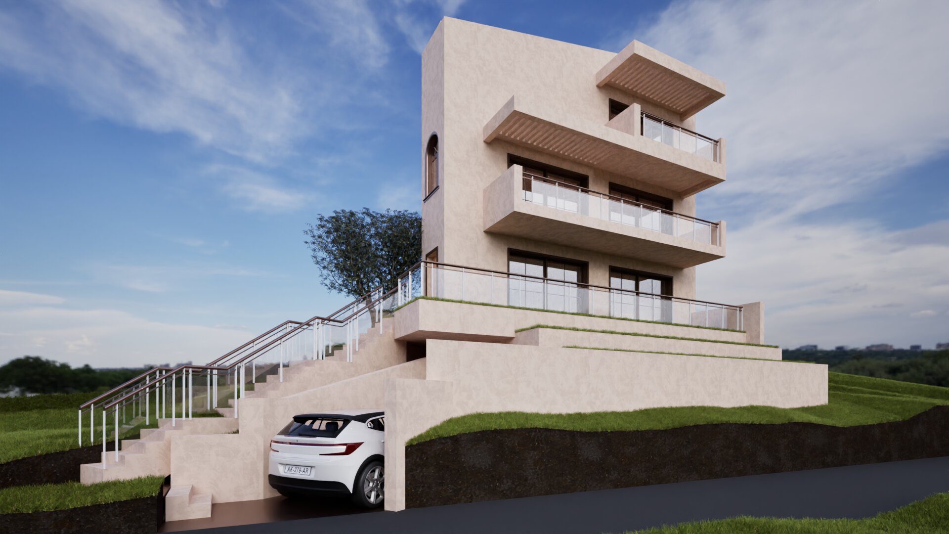 add short mediterranean vegetation on the grass don t add vegetation at the balconies