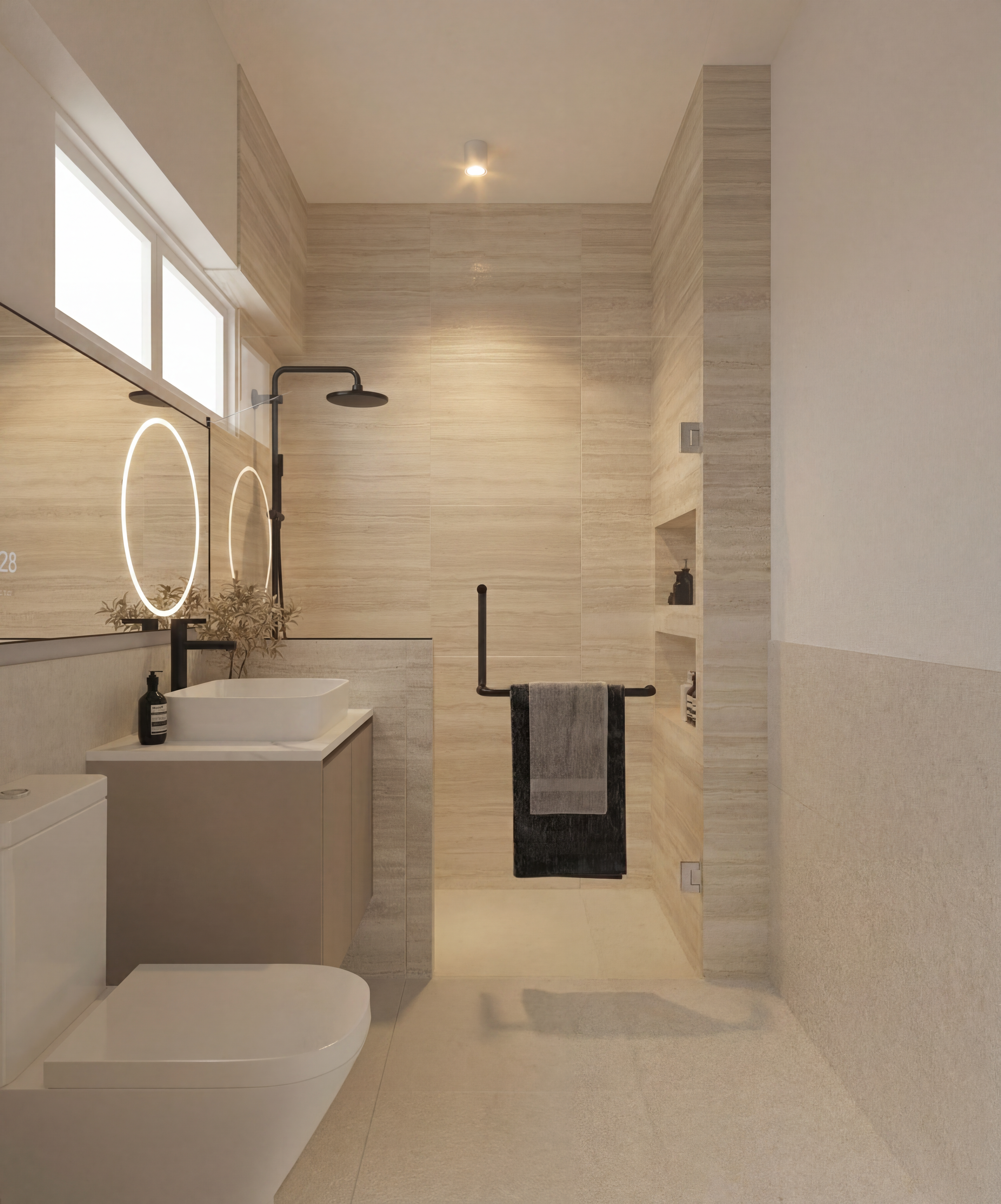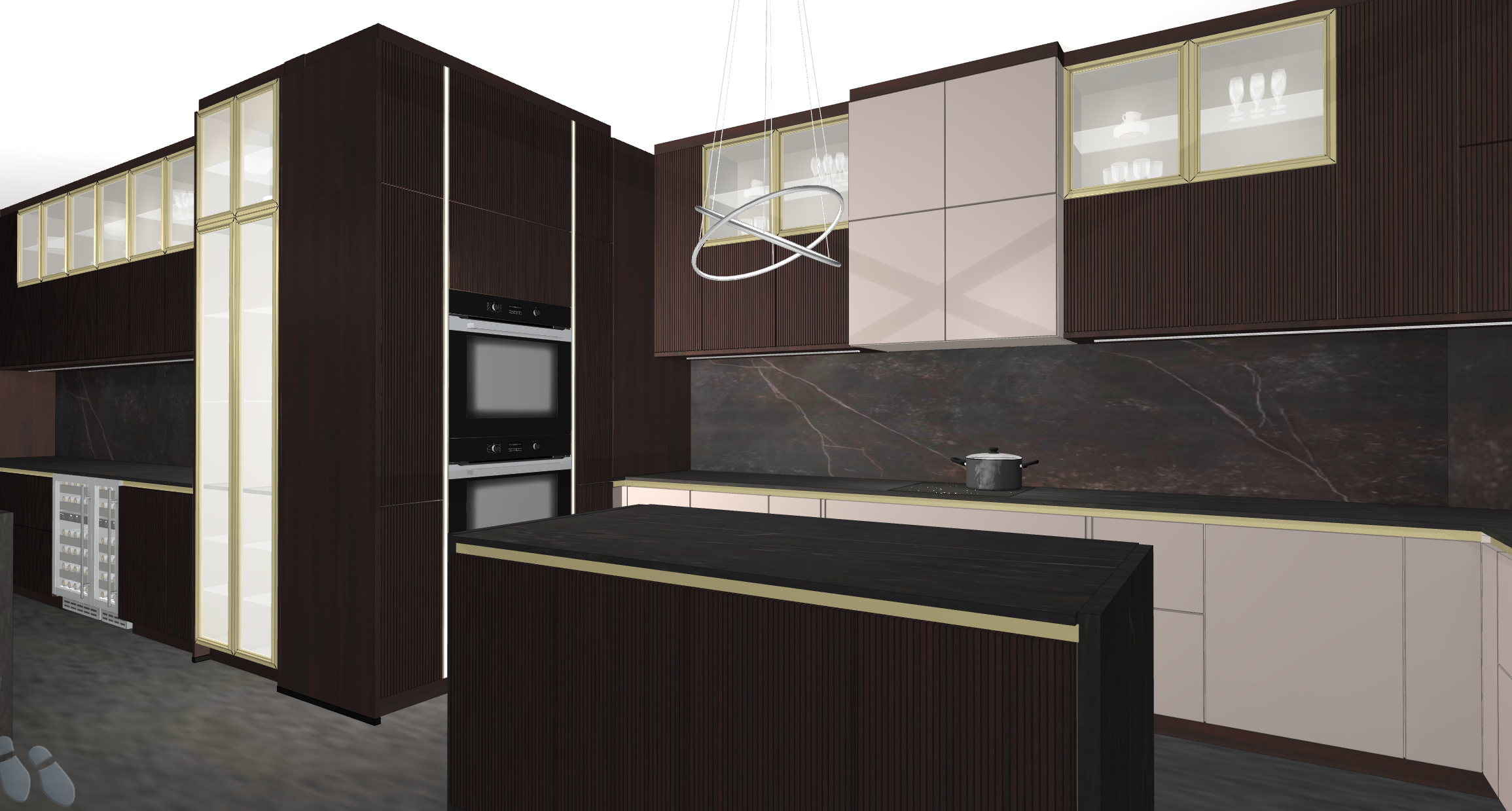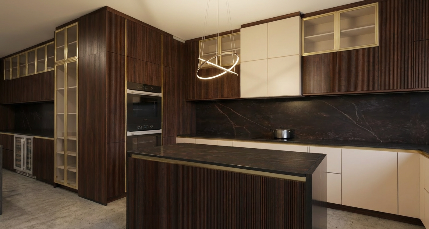 elegant kitchen inside the glass cabinets are solid cream color