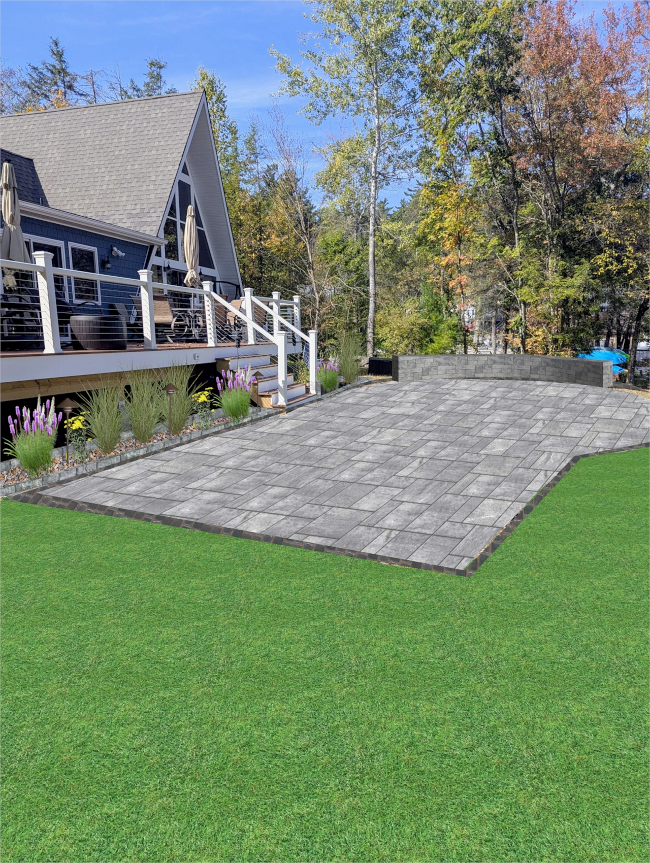 a manicured lawn layered flower beds low maintenance shrubs native plants stone pathway leading to the entrance