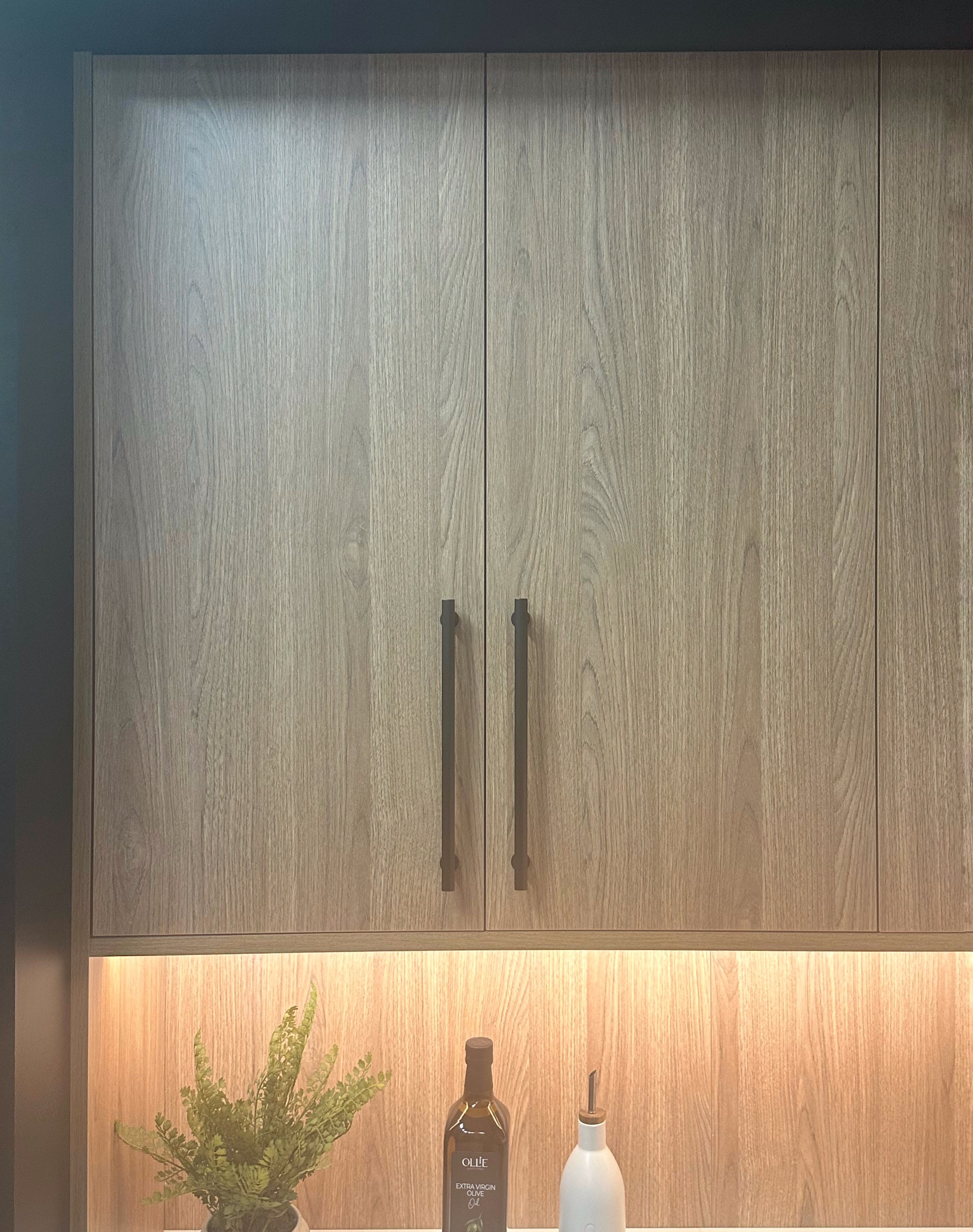 do not change the cabinets in any way preserve the exact cabinet colors materials finishes dimensions door and drawer styles hardware spacing alignment and all geometry exactly as shown do not alter the countertop shape backsplash appliances flooring lighting fixtures or wall structure only remove the construction materials clutter and mess from the scene clean the room and make it look finished and staged add a few simple tasteful home accessories appropriate for the style of the space but do not add or remove any furniture windows or architectural elements maintain the original lighting direction and realism enhance clarity and polish the photo while keeping the cabinetry and room design completely unchanged do not alter the lighting to keep the cabinet colors as they are in the image soften the undercabinet lighting increase natural light stage the countertop for a kitchen