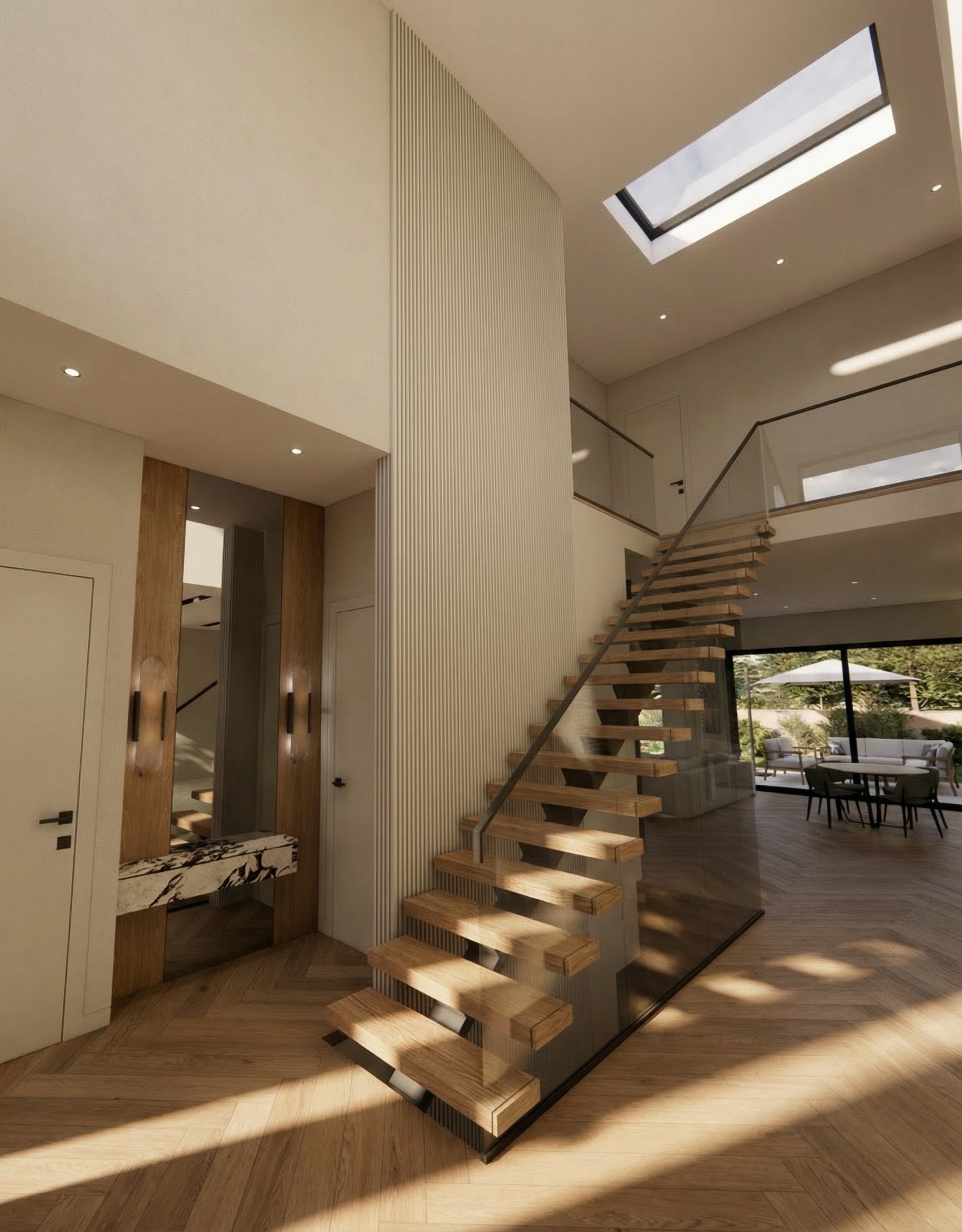 keep all the colors and materials very light white oak herringbone hardwood for floors and same color of wood for stair steps outside the large glass doors a lush green garden is visible enhancing the serene elegant ambiance