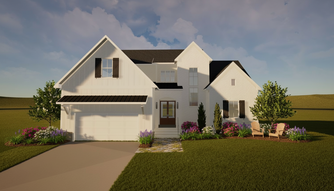 make photorealistic soft warm light with some clouds fasade in striped metal with soft gloss textile shades on the windows warm light inside the building lot of big trees change the small tree in the front for big tree higher grass with white flowers people walking and biking