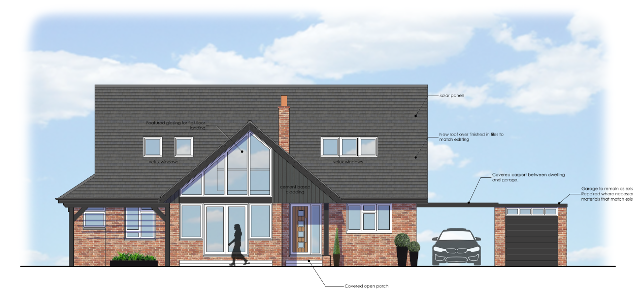 red brick black vertical cladding slate roof tiles white window frames dark fascias bargeboards black gutters 3d realistic visual
