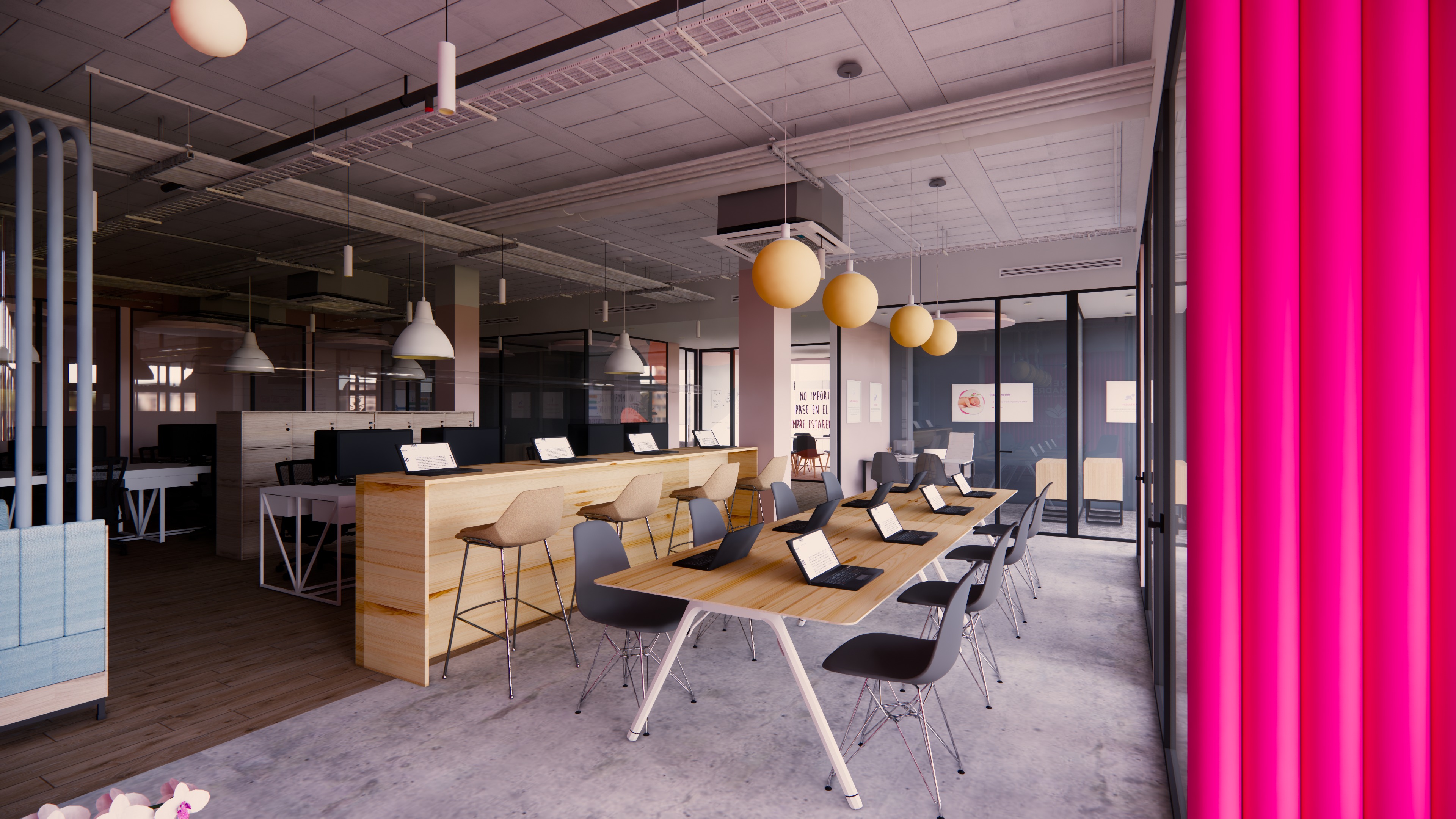 photorealistic real office interior in mexico preserve exact geometry and layout no design changes warm artificial lighting 3000k as main source soft and diffused light slightly flat lighting minimal contrast natural camera exposure subtle cool daylight from windows only as secondary light exposed white painted ceiling with visible ducts pipes and slight imperfections industrial ceiling with realistic wear light oak laminate flooring with subtle variation and use gray matte tile flooring blush pink columns and walls slightly uneven glass partitions with black frames soft reflections slight smudges and subtle opacity variation no perfect transparency long communal table with natural wood top and white metal legs subtle imperfections in wood grain and slight tone variation black plastic chairs laptops open on table with visible cables notebooks and small everyday objects wooden bar counter with stools in light neutral tones slightly imperfect materials matte finishes no glossy surfaces clean but lived in office environment slight visual clutter no people no human figures no silhouettes documentary architectural photography style eye level camera 28mm lens warmer color temperature softer shadows reduced contrast natural lighting balance subtle visual noise realistic camera grain no people no human figures no silhouettes no dramatic lighting no cinematic lighting no high contrast no dark shadows no empty unrealistic space no ultra clean surfaces no glossy materials no luxury finishes no perfect symmetry no showroom style no exaggerated reflections no glowing lights