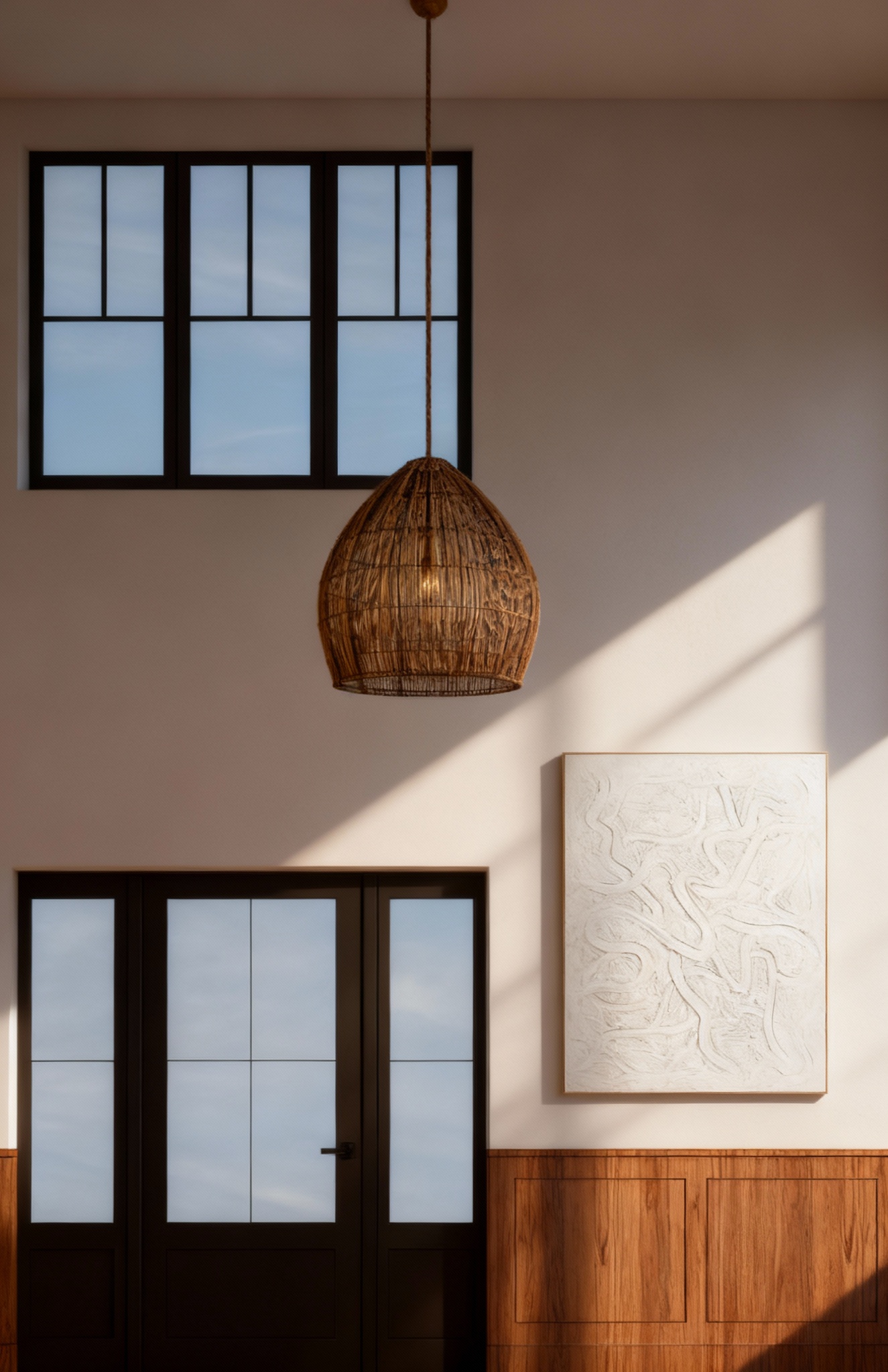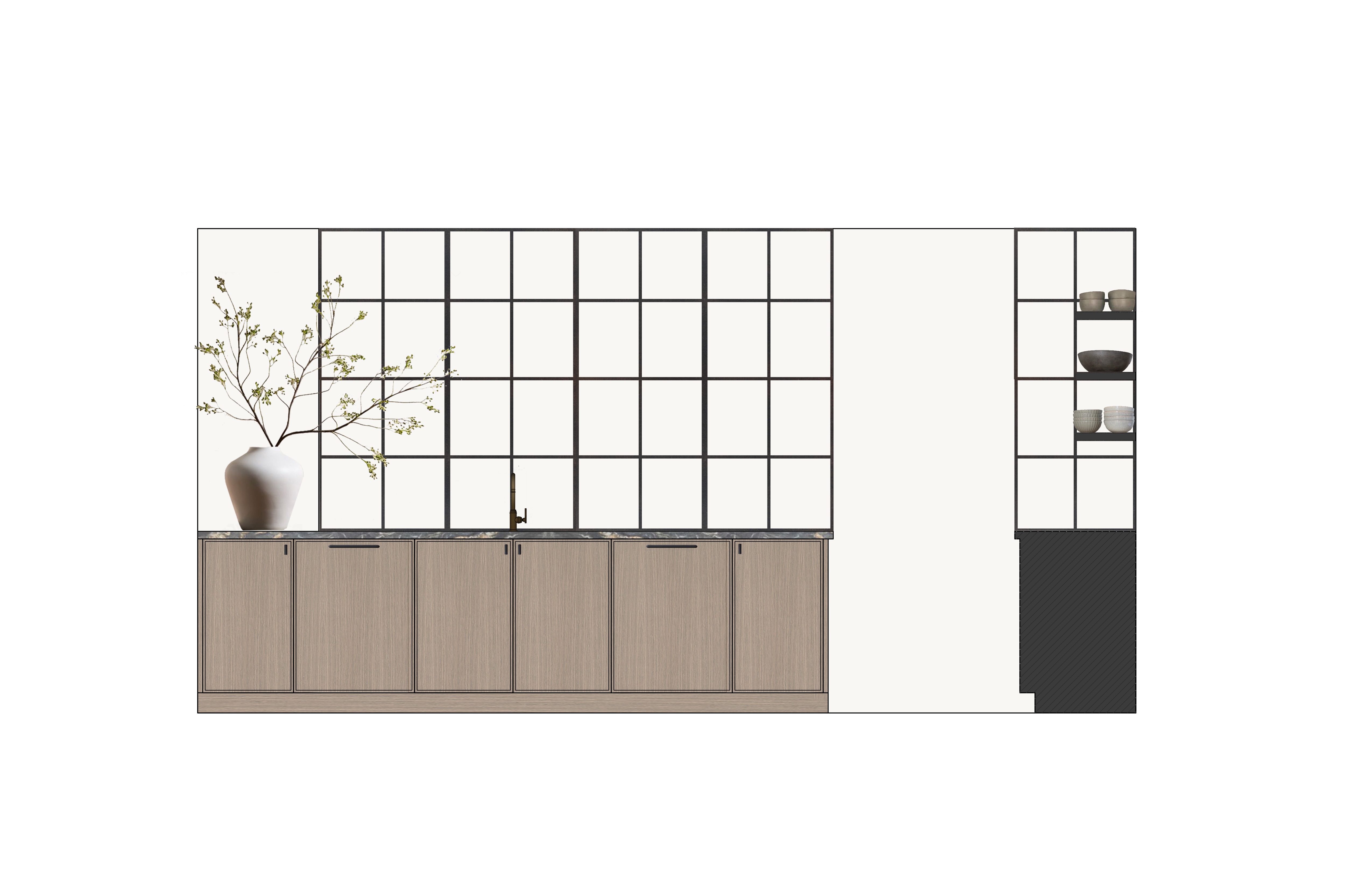 the partition behind the counters is clear glass with an iron frame make the room brighter