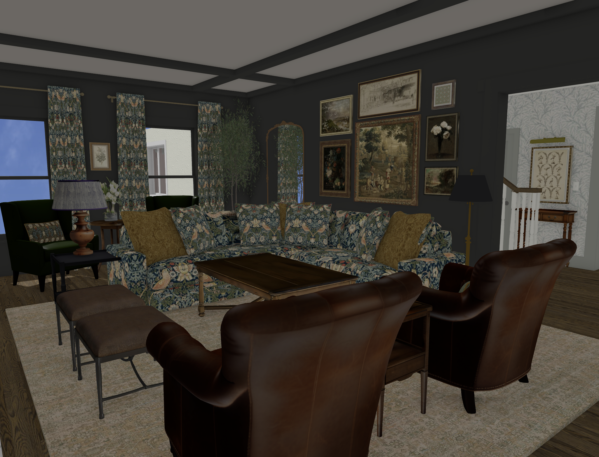 render with sunset glow coming in turn the lamps on for added light tone down the yellow in the sunset glow and make background in the windows a fall scape