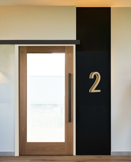 enhance this image to look more realistic add a back glow behind the letter 2 add a person to the left side of the door
