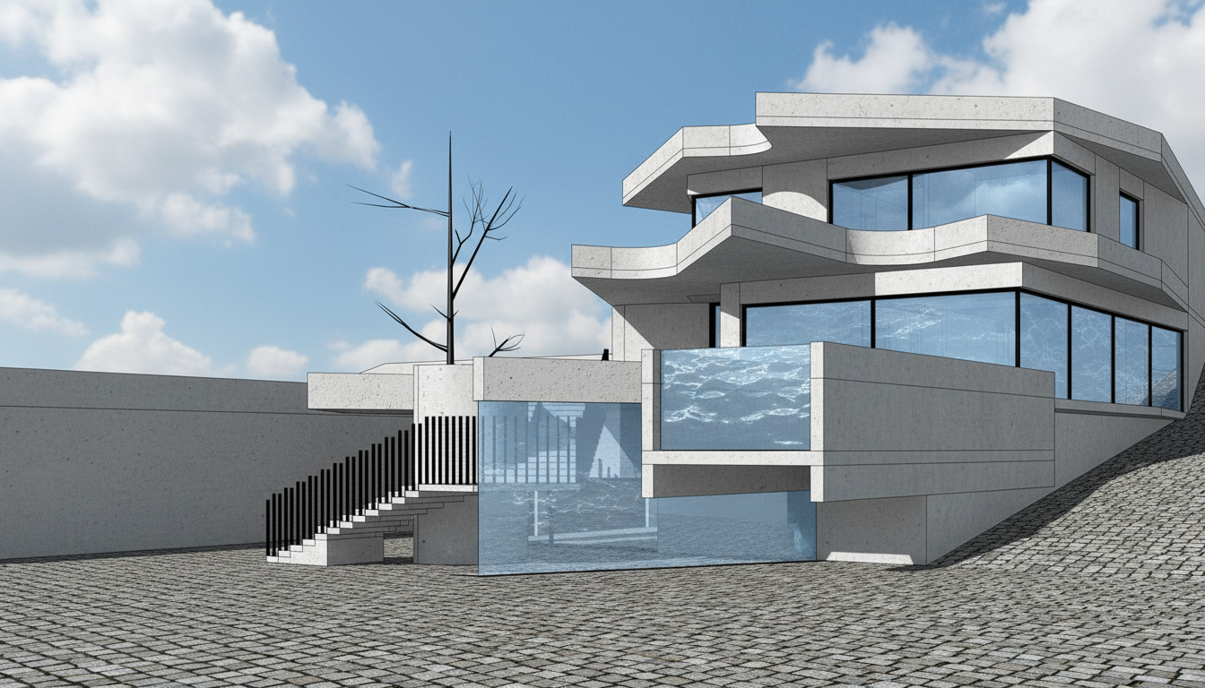add cocnrete texture on building add sky in the back and green fields add water in pool