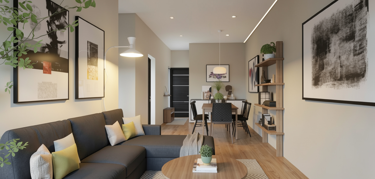 photorealistic interior render of a contemporary living room and dining area strictly preserving the original image composition camera angle geometry layout furniture placement materials lighting and colors the scene includes an l shaped dark gray fabric sofa with cushions a round wooden coffee table a dining table with chairs a wooden shelving unit on the right wall wall art plants and wood flooring global illumination soft natural daylight mixed with warm artificial lighting all lighting must remain exactly as in the original image no intensity changes no color shift no added light sources except the one specified critical edit only activate a warm recessed led strip on the right side of the ceiling plafon the led must be subtle warm white around 3000k soft continuous linear light clean integration into the ceiling detail lighting control the led must emit very soft controlled light no overexposure no strong light spill no hotspots no harsh gradients the effect must be minimal and realistic critical restrictions do not add any led on the left side do not modify existing lights do not change lamp intensities do not alter shadows do not rebalance the scene lighting do not affect wall colors right wall protection the right wall must remain visually clean and uniform avoid visible light patches or strong gradients caused by the led keep the effect subtle and indirect strict preservation rules do not modify any furniture do not move objects do not change materials or textures do not alter reflections do not change composition or camera framing no additional objects no redesign no geometry changes ultra photorealistic render high quality pbr materials ray tracing global illumination soft shadows no stylization no artifacts clean controlled lighting