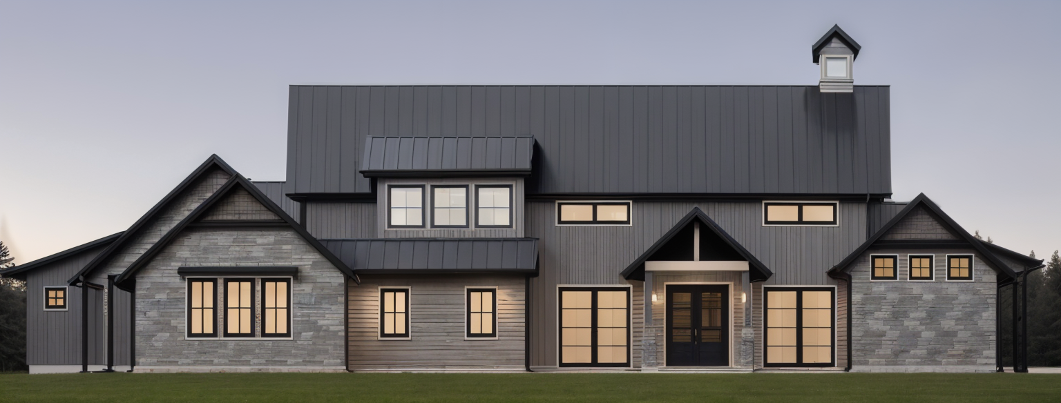 expessionism exterior shot black steel roof dark gray siding gray and white stone and medium brown wood accents architecture