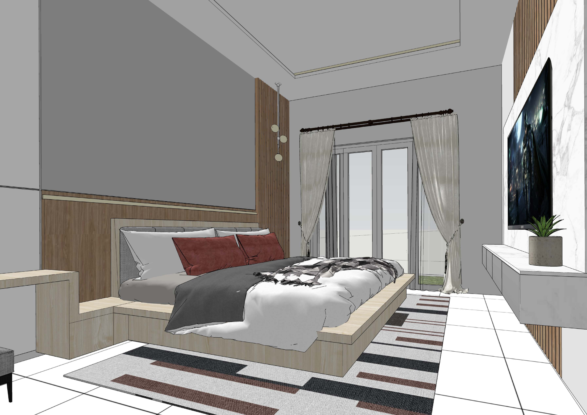 realistic architectural interior render of a modern minimalist space of a house keep the exact original layout proportions furniture placement materials and camera angle no redesign no added or removed elements clean contemporary aesthetic with soft neutral color palette natural daylight entering from large sliding glass doors with sheer curtains soft diffused sunlight realistic shadows warm indirect cove ceiling lighting subtle led strip glow balanced exposure real life material textures physically accurate materials pbr textures correct reflections subtle glossiness variation soft ambient occlusion global illumination ray traced lighting realistic camera lens 35mm eye level perspective correct scale and depth clean styling minimal clutter photorealistic interior photography high dynamic range sharp details natural color grading architectural digest style the picture frame on the image is a tv