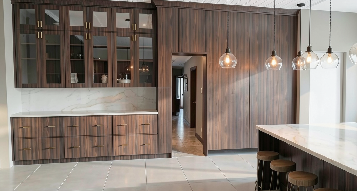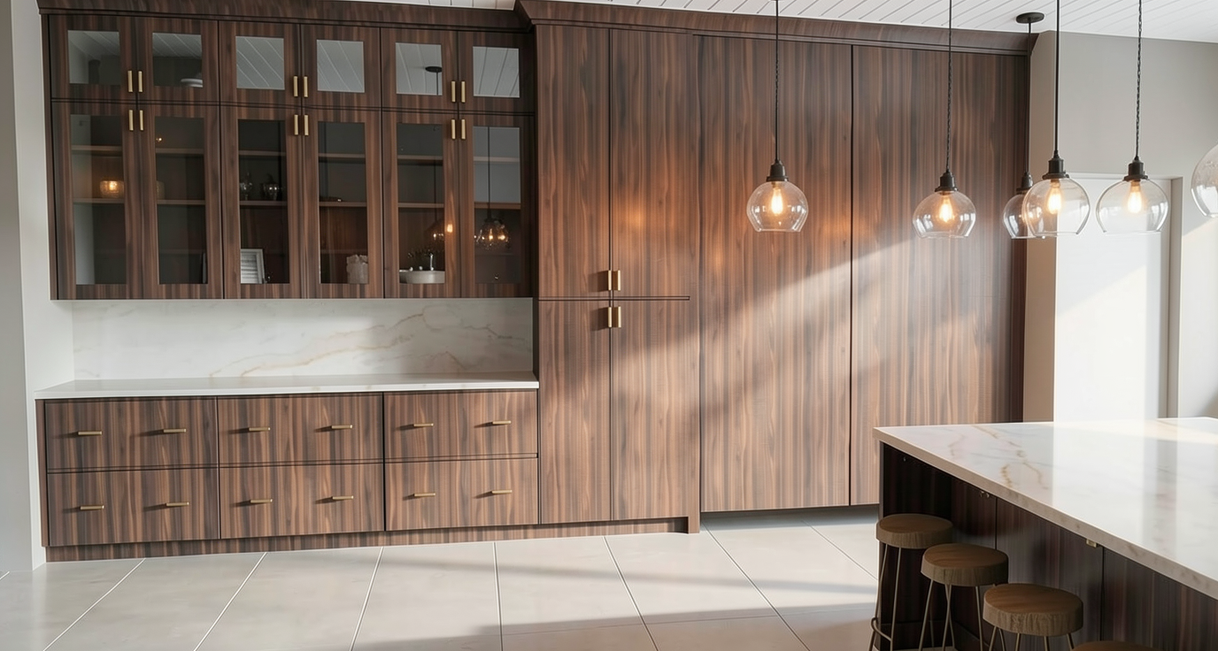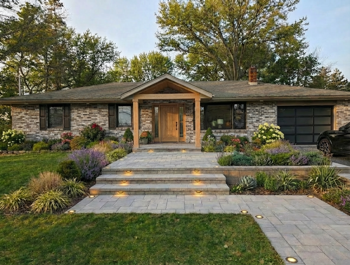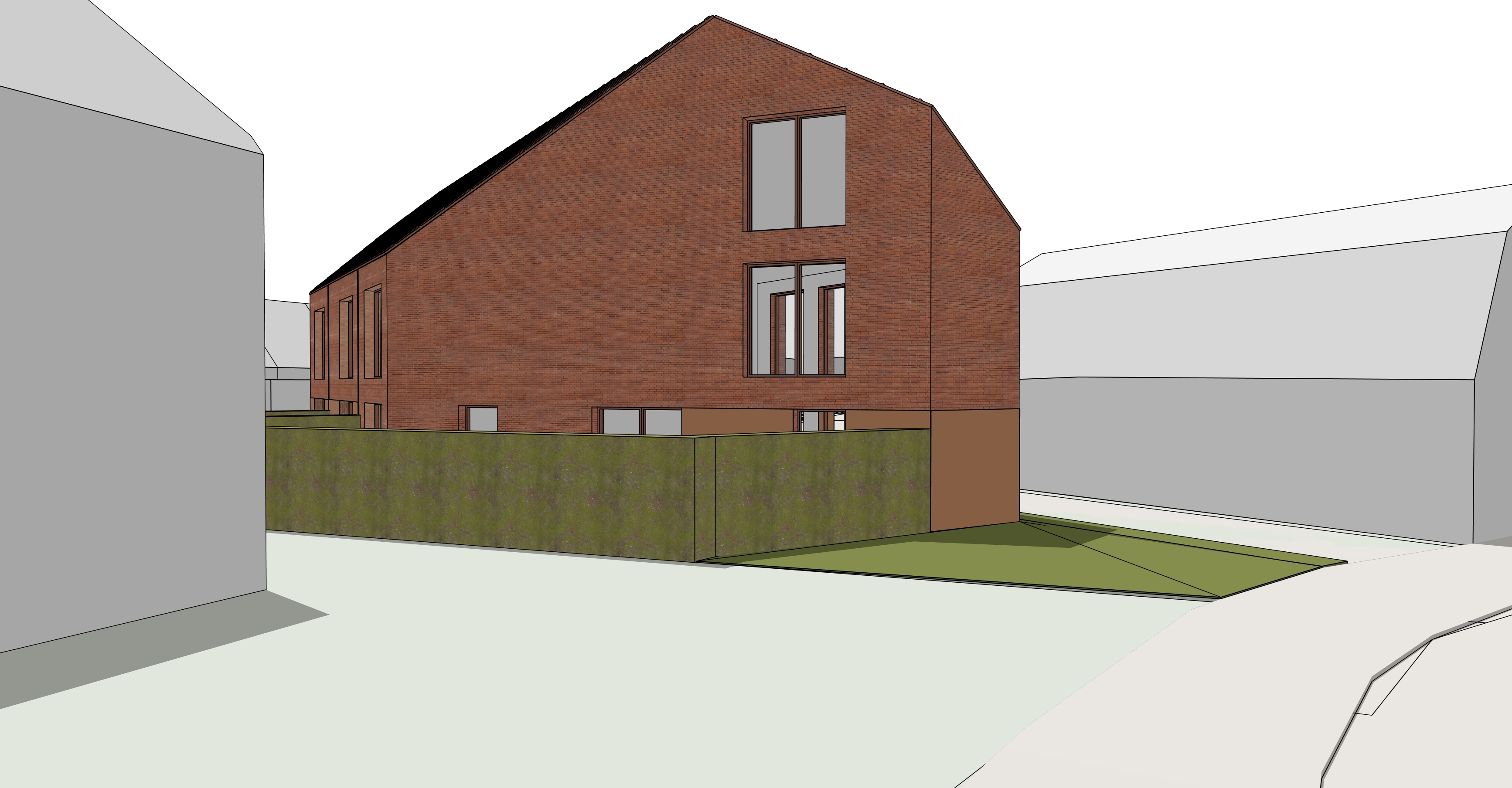 create a warm and inviting residential courtyard scene inspired by contemporary dutch architecture the main buildings should feature fa ades made of red brown mottled brick and window frames in an orange red brown tone the roof detailing must consist of vertical panels in a red brown color with a matte weathered texture adjacent buildings may appear more abstract while still maintaining a sense of neighborhood cohesion and should be entirely bright white with large glass areas to create contrast use the exact perspective of the provided reference image and do not alter the composition in any way between the sidewalk and the bottom edge of the window frames include a trasraam plinth made of pigmented concrete in the same color as the window frames place some softly draped open white curtains behind the glass to add residential warmth and interior depth depict an autumn like day in the netherlands with soft slightly diffused daylight and gentle warm tones with the sun positioned later in the afternoon on the right side of the scene include a tree with autumn foliage in front of the buildings on the left side of the street in front of the last building add an additional tree behind the main building add five big trees to create a natural backdrop include a parking area with a few cars and surround each parking space with a hedge approximately 50 cm high in front of the building add small garden areas with grass and flowering plants to enhance the residential character include a pedestrian sidewalk and use traditional dutch style brick pavers for the street surface add subtle landscaping and a few people walking or cycling to create a calm community oriented atmosphere