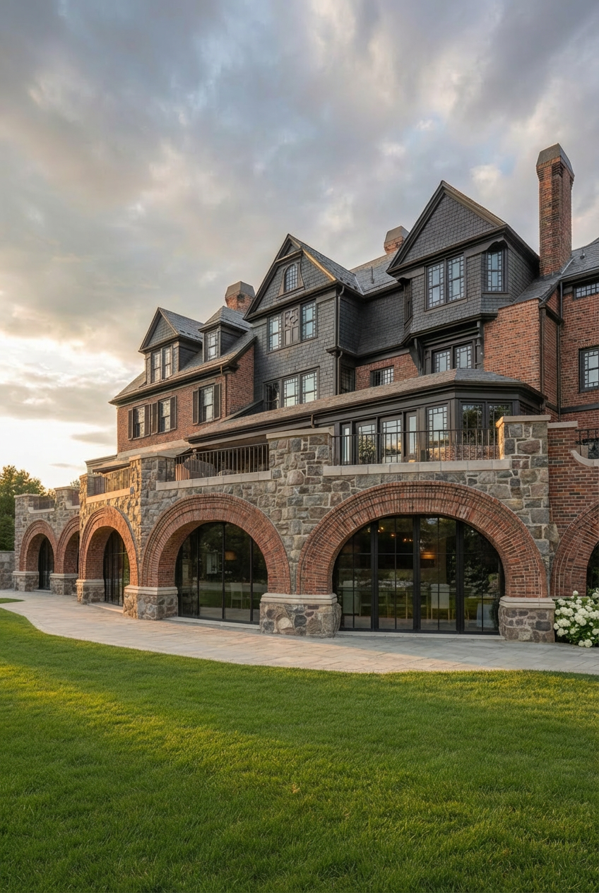 make arches a combination of large stones and brick make all upper brick portions to be dark shingles to match the ones in the image already
