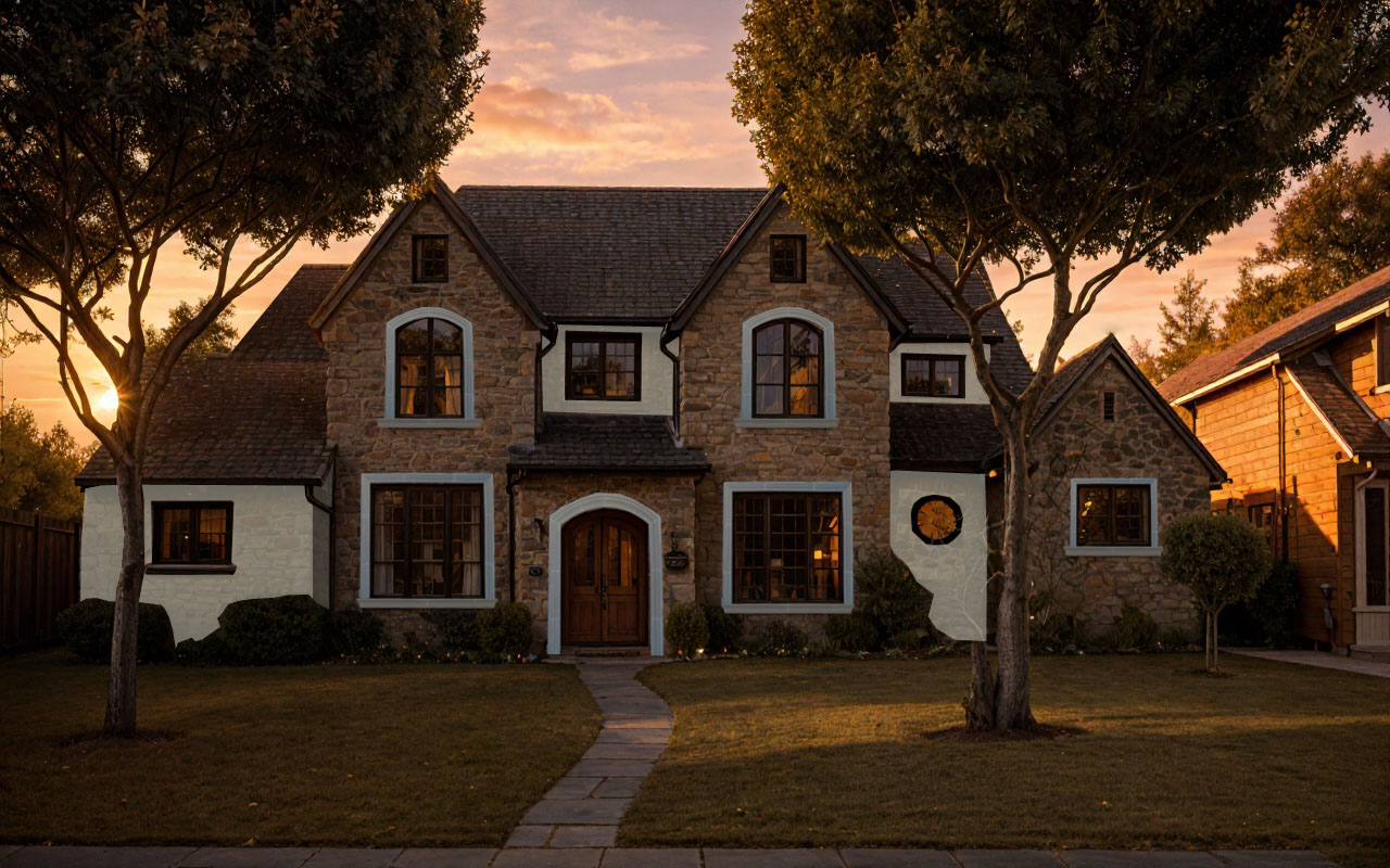 grandbury stone and tan slurry brick home with cast stone surrounds and composition roof show in daylight