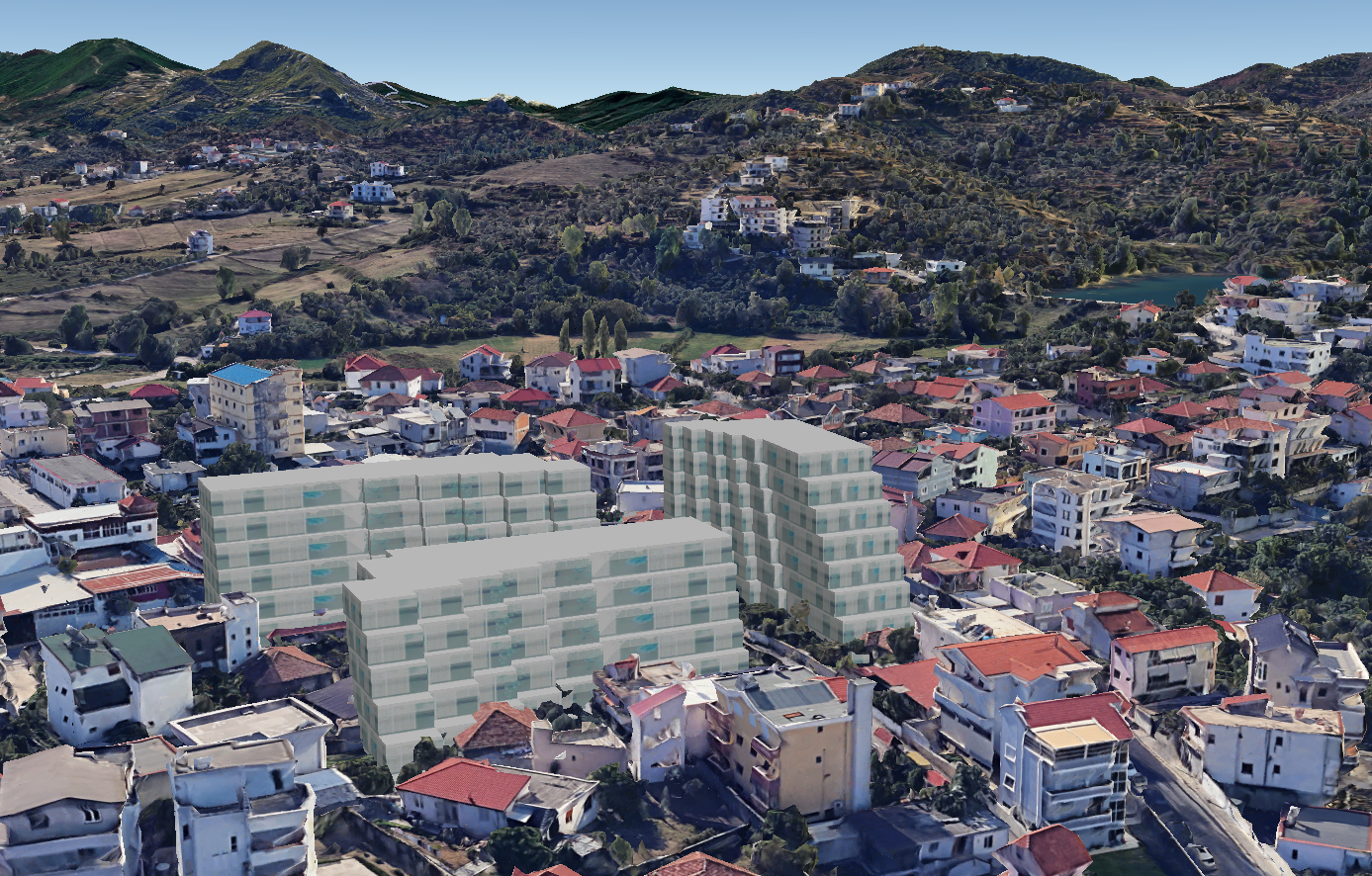 photo of modern residential buildings nestled within a suburban landscape showcasing glass facades and sleek lines emphasize textures of glass and concrete with balconies providing outdoor space the surrounding area features traditional houses with red roofs set against lush green hills bright daylight casts soft shadows enhancing the building s transparency aerial perspective with a wide angle lens captures the contrast between modernity and tradition in the urban context