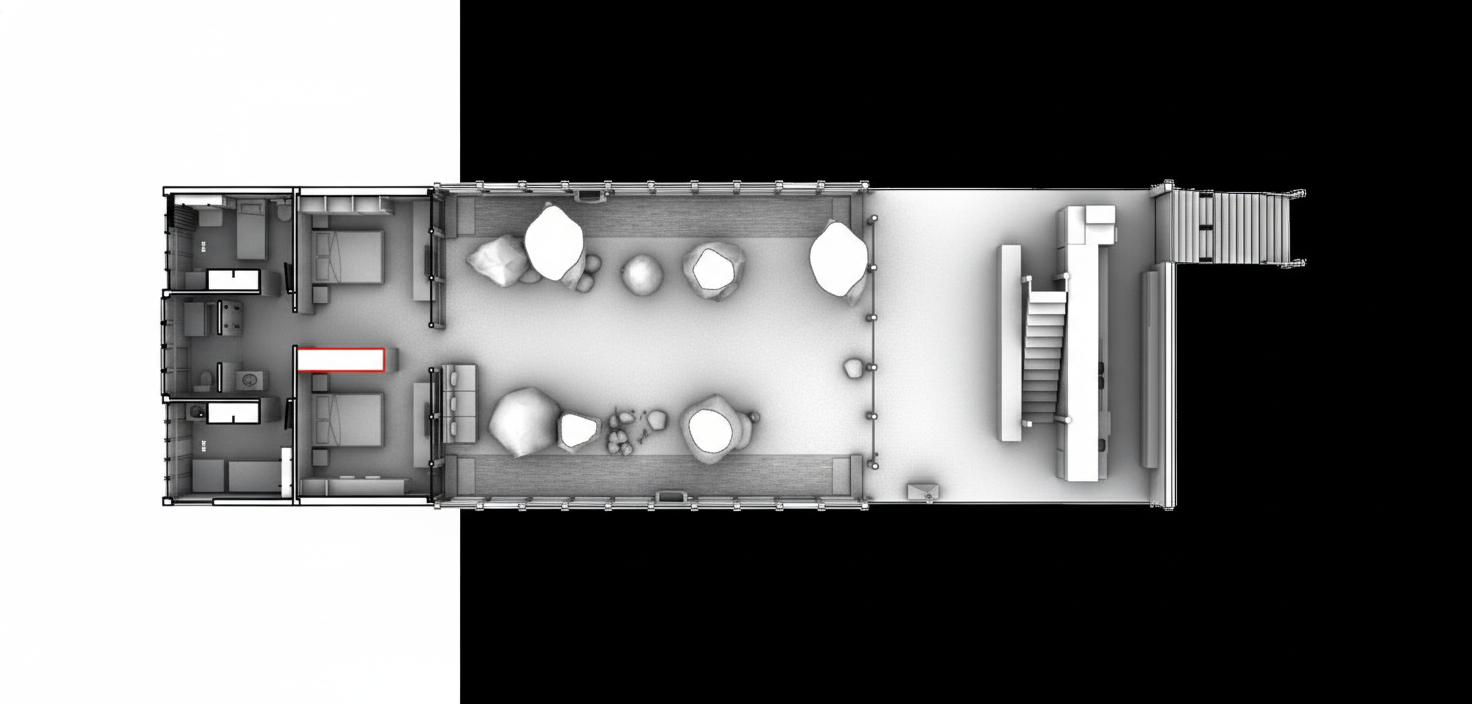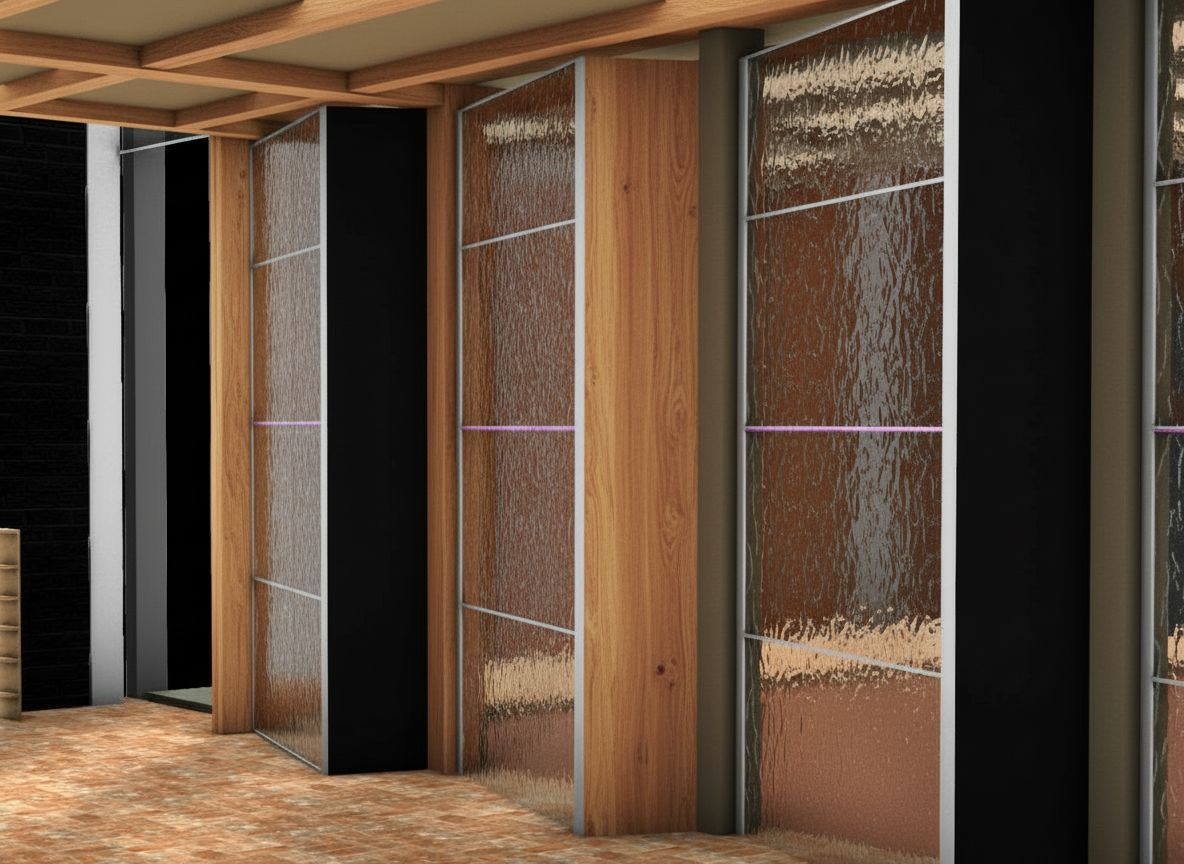 make a warm image with sunrise coming from behind the glass doors cast shadows towards the front of the image