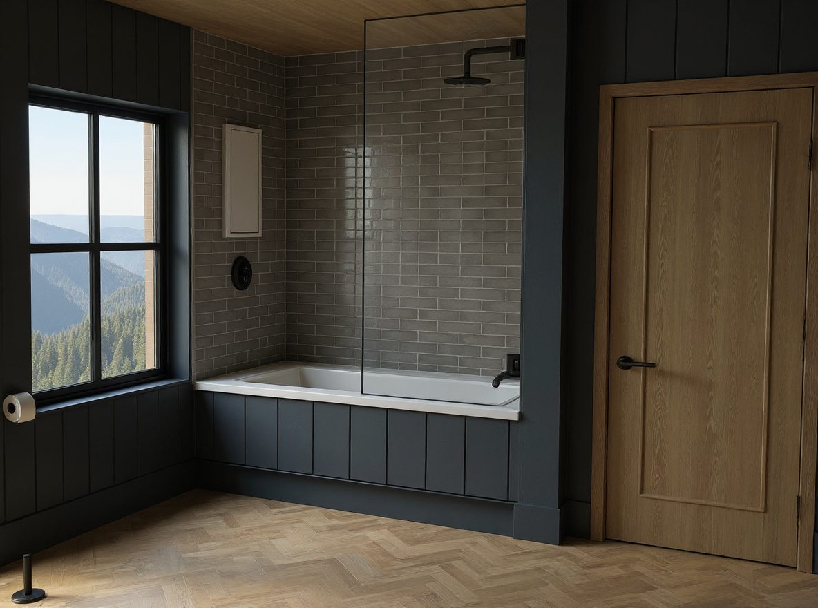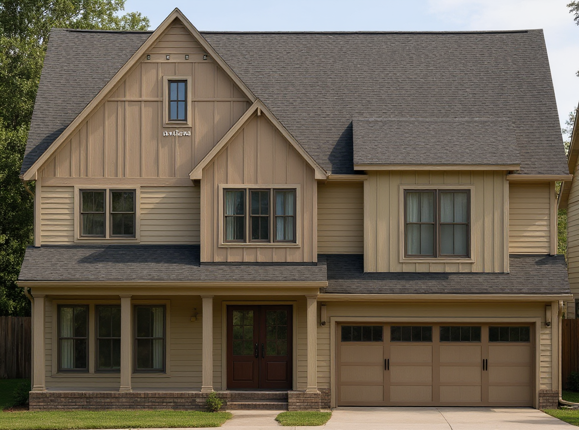 do not change perspective and proportions of image or the curved black wall at first floor level add a small amount of wild flowers to some of the grass areas add vertical black modern cladding to the upper level dark walls make the house look classy the ground floor and chimney is a concrete finish