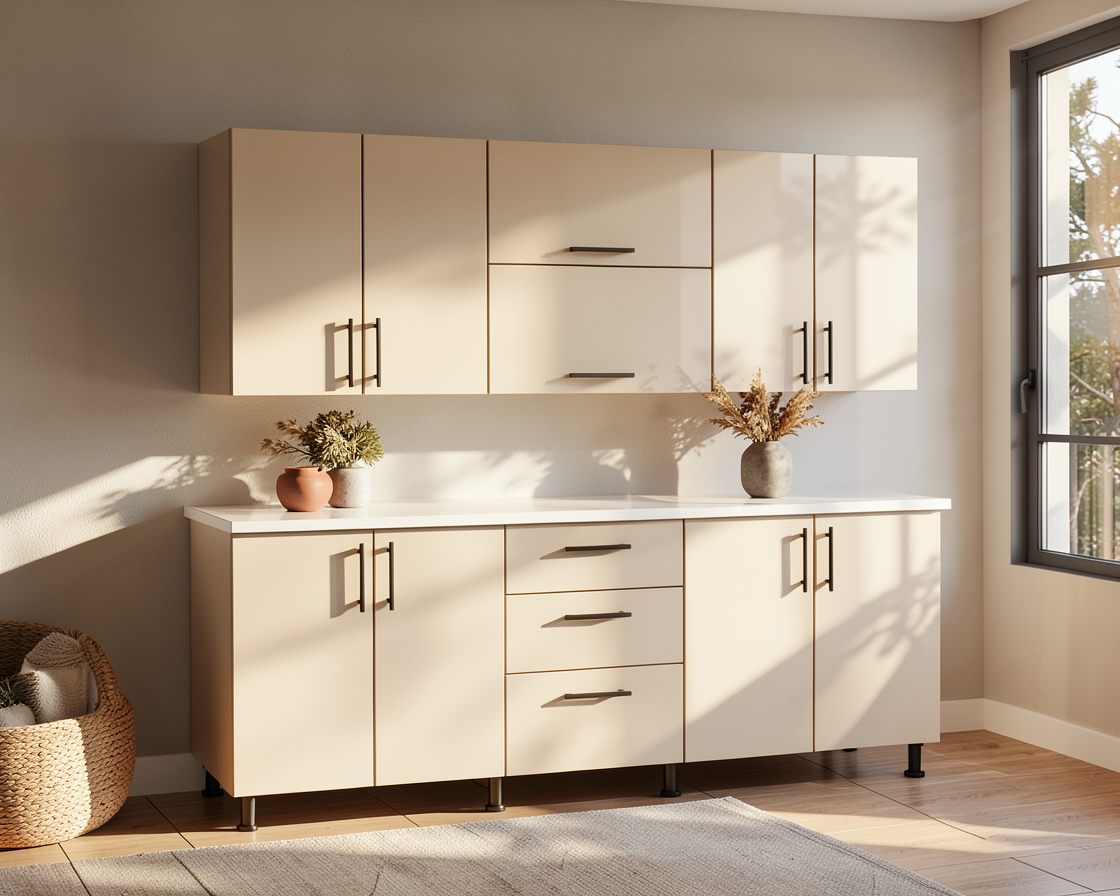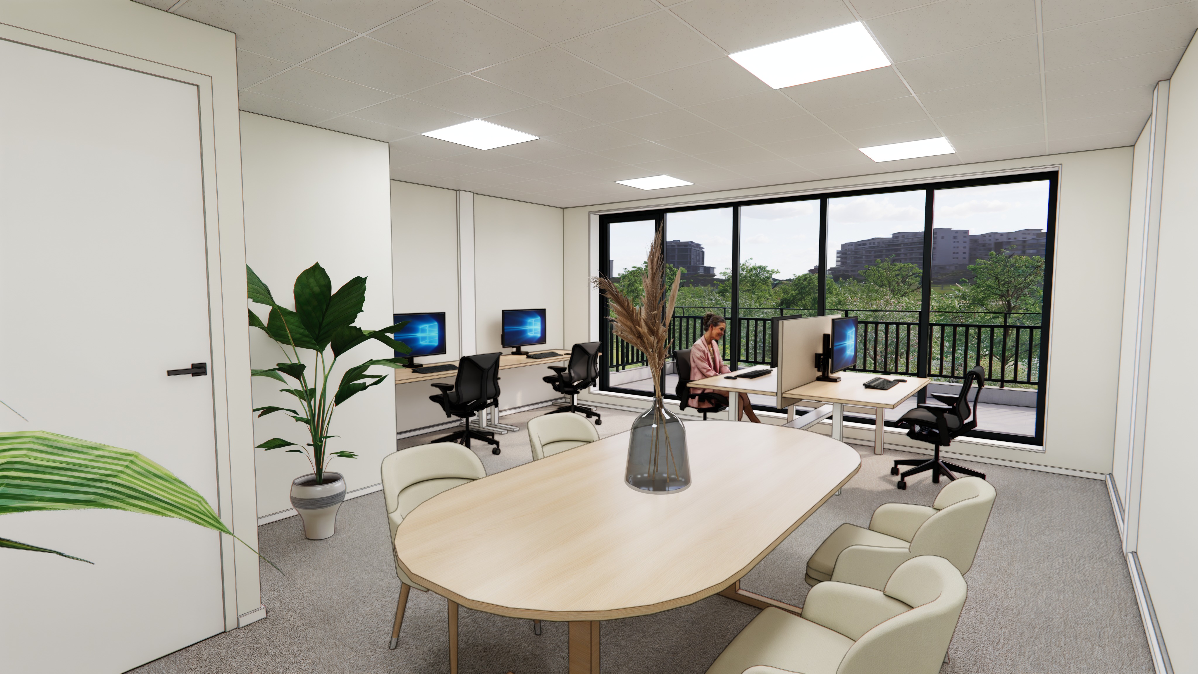 photorealistic rendering of existing interior office design preserve all architectural elements exactly as shown do not change layout materials furniture or spatial composition enhance realism of existing materials light oak oval conference table with tapered wooden legs cream upholstered lounge chairs light grey carpet flooring white painted walls white ceiling tiles with recessed led panels black framed floor to ceiling windows with balcony railing view of trees and apartment buildings outside acoustic desk divider panels light oak sit stand workstations with white steel frames black ergonomic office chairs large tropical plant in grey pot add realistic accessories and styling details only on conference table add scattered notebook pens water glasses small water pitcher laptop open at one seat phone on table subtle reflections on table surface glass vase with pampas grass enhanced with realistic glass refraction and light transmission on workstations add coffee mug sticky notes on monitor bezel small personal water bottle phone mouse pad realistic soft shadows under all furniture subtle light reflections on window glass natural daylight casting soft shadow patterns on carpet photorealistic architectural interior photography shot on canon eos r5 28mm lens slight depth of field subtle film grain 8k resolution