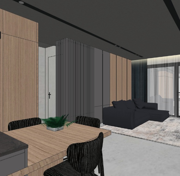 photo realistic ultra detailed architectural rendering of the modern room from image 0 png the perspective is a wide angle straight on interior shot the full height cabinetry features mdf doors with a smooth matte finish in ncs s6500 n dark gray the wood laminate elements headboard panel shelving desk and right side display nook are finished in detailed egger h1303 brown belmont oak with visible realistic wood grain the dark gray upholstered bed with its exact black and white pillows is positioned precisely all shelf decor is identical the specific hanging trailing plants small vases and books must be copied to their exact positions the integrated led strip lighting on all shelves is active emitting a warm 3000k light the modern chair is at the wooden desk on the right bright natural daylight streams through the floor to ceiling glass window door which is flanked by the sheer white and dark curtains outside the window a clear sunny bright daytime view of a blurred urban environment is visible with harsh sunlight creating defined shadows and highlights on the curtains the patterned rug and the floor mixing with the warm led light all elements including wall paneling doors power sockets and light switches are replicated perfectly the floor has polished concrete texture and the specific patterned rug sharp focus high end photography cinematic lighting photorealistic textures photoreal natural daylight negatives for stable diffusion flux drawing painting cartoon 3d render art style sketch incorrect geometry wrong plants missing details incorrect texturing blurry messy room