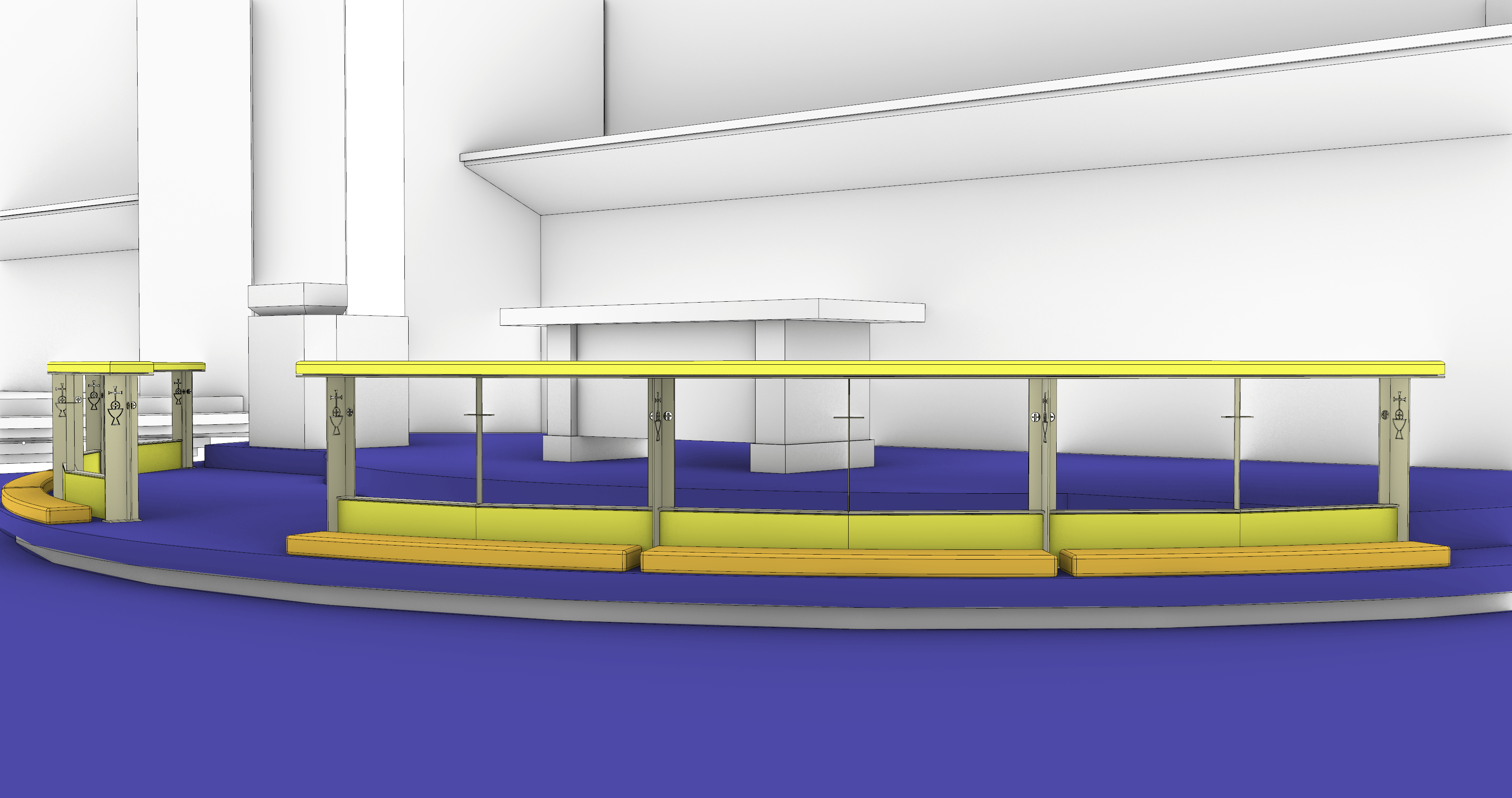 the gold vertical supports are black iron steel the yellow parts are crema cenia marble the yellow parts are dark blue cushions the blue floor is blue carpet the background should be left as white