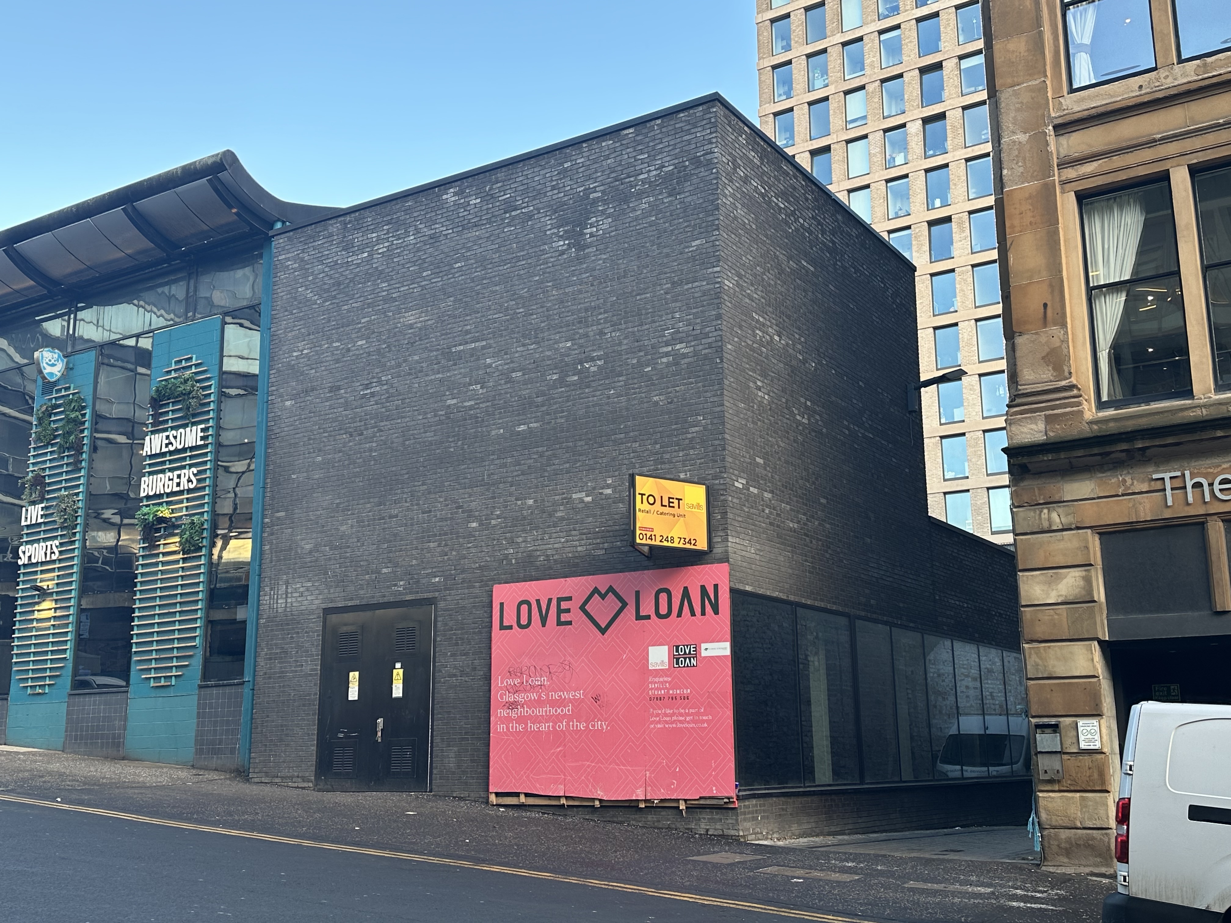 remove hoarding and yellow sign ground floor glazing should wrap around from the lane onto the front only the area behind the hoarding