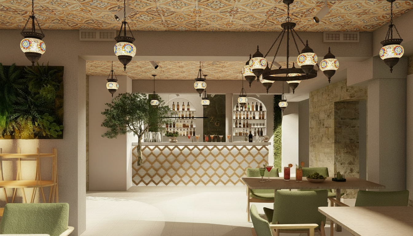 use the provided floor plan to place the furniture and lighting set a leather seating bench along the wall and arrange tables and chairs according to the floor plan layout the red dots on the plan mark the lighting positions use them to place warm ambient lights create the atmosphere of a mediterranean tavern with natural stone walls wine bottles on shelves pampas grass and warm cozy lighting inspired by the reference images the rotated square ceiling should have soft linear lighting along its edges keep the materials realistic and detailed and make the scene photorealistic and inviting do not change the geometry only use the plan to position the furniture and lights use chairs as on the referent picture