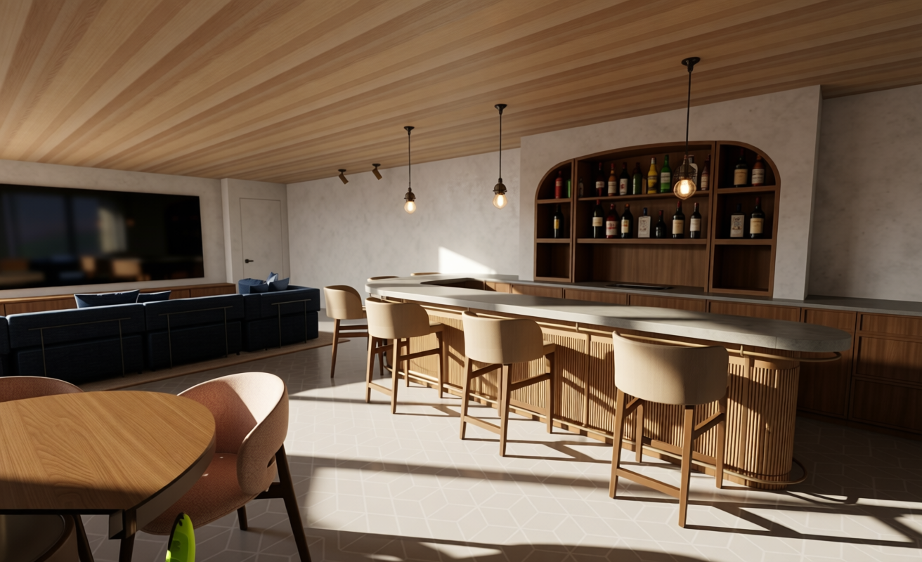pilates studio entrance lobby on the left door black grey reception desk curved modernistic vertical shelf with lights part for coffee machine cappuccino colors beige oat with black details all switches black floor is stone beige color walls light beige or warm white vegetation plants lights right wall pilates studio logo reception desk 2 colors oat and natural stone mirrors and concrete walls