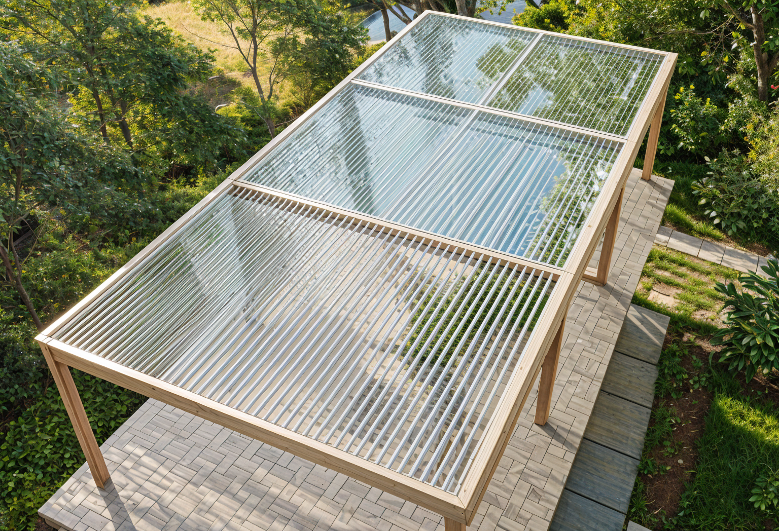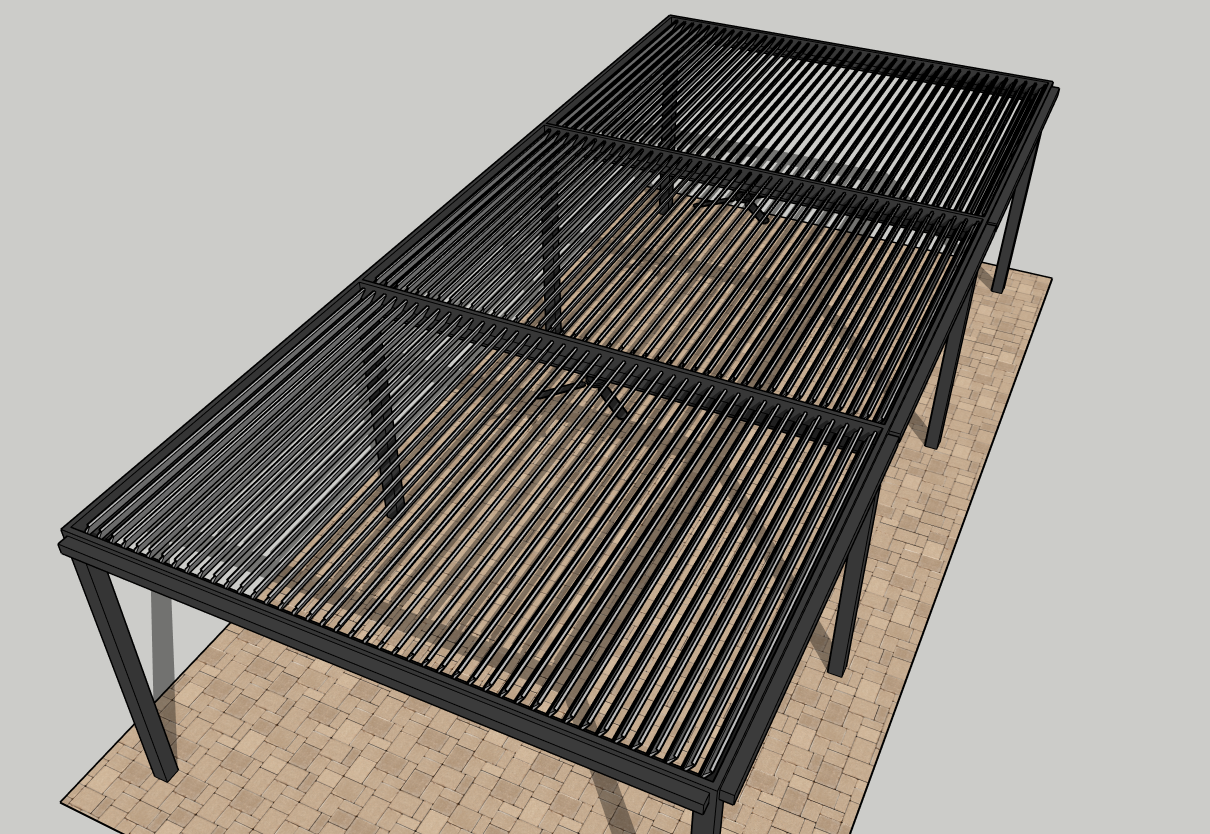 make this into a aluminum louver roof with a slightly darker gray color frame and add a nice background with some trees around