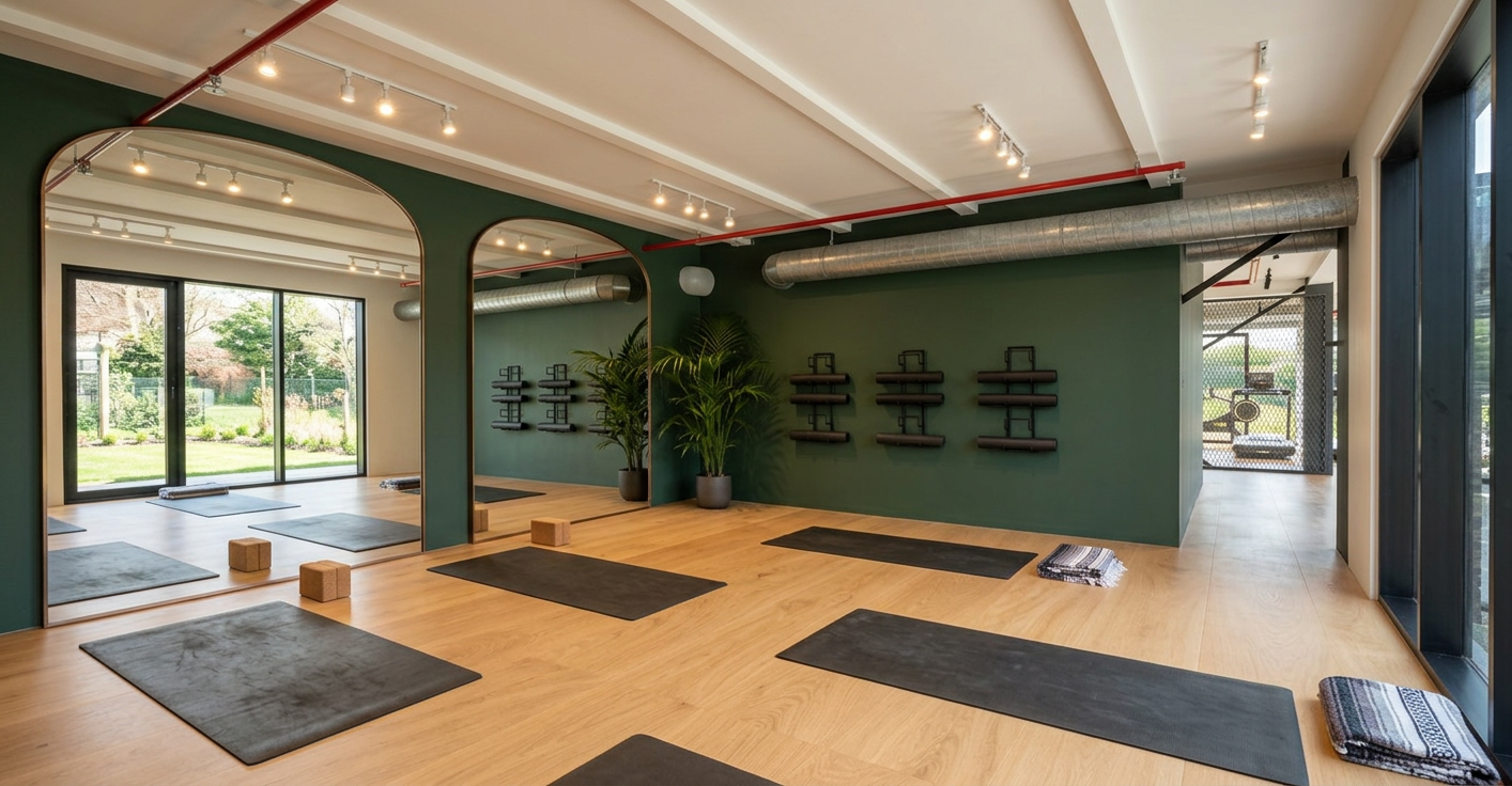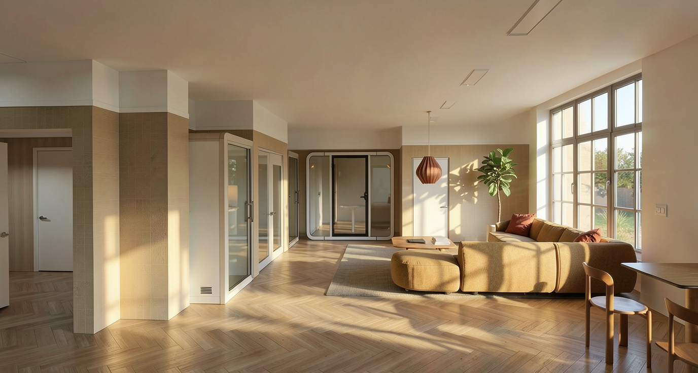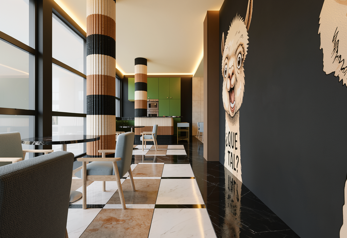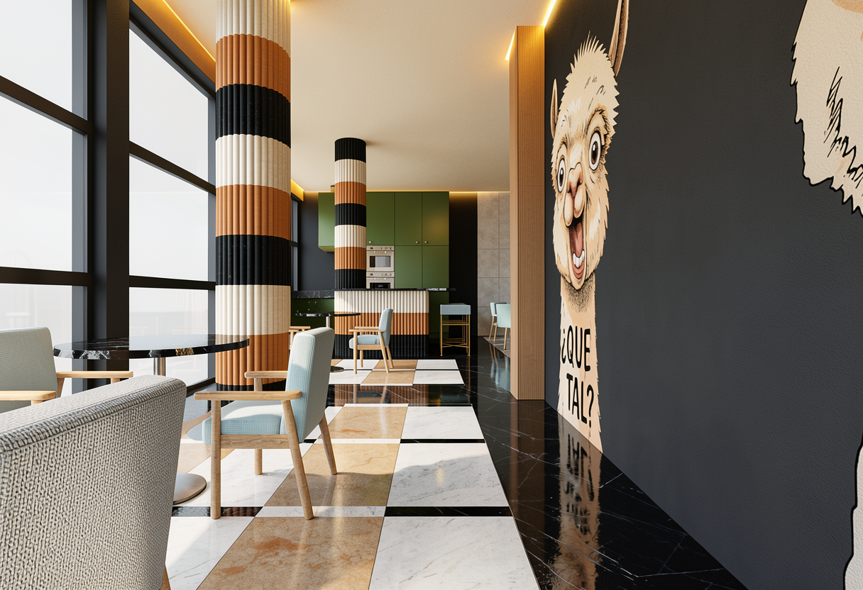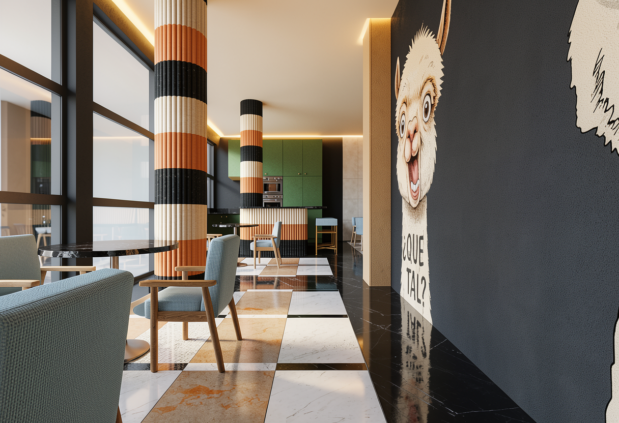 enhance this restaurant interior render without changing any geometry proportions panel layout niches doors furniture kitchen cabinets island columns or flooring do not add any spotlights or visible light fixtures preserve all original colors materials and textures exactly as they appear in the base image including walls panels mirrors tables chairs upholstery light blue kitchen cabinets green black walls fluted columns island tiles black cheddar beige doors floors and wallpaper lock all geometry including the ceiling but paint the ceiling beige to match previous interior views materials textures refine walls panels mirrors marble tables wooden chairs mosaic floors kitchen cabinets columns and island for subtle realism and texture enhancement beige and orange 3d printed panels maintain precise stereotomy subtle matte finish fine layering and alignment black mirrors and marble surfaces soft realistic reflections without changing color or intensity wooden chairs correct grain orientation natural subtle variation columns and island tiles refine surface texture while maintaining original three color pattern lighting enhance existing warm led lighting along the ceiling perimeter ensuring concealed leds softly contour every element the ceiling intersects with walls panels columns niches island to emphasize depth and 3d form lighting should remain soft warm cinematic and realistic producing subtle shadows and reflections on floors tables panels and mirrors atmosphere create a cinematic elegant inviting and luxurious yet understated mood enhancing depth material realism and warmth without changing any geometry proportions layout or original colors except ceiling color instructions for reliability across multiple views apply enhancements consistently to all visible surfaces in the frame do not introduce new geometry or alter existing elements maintain precise alignment and proportion of panels furniture columns and kitchen elements ensure concealed led highlights adapt naturally to perspective and intersecting elements