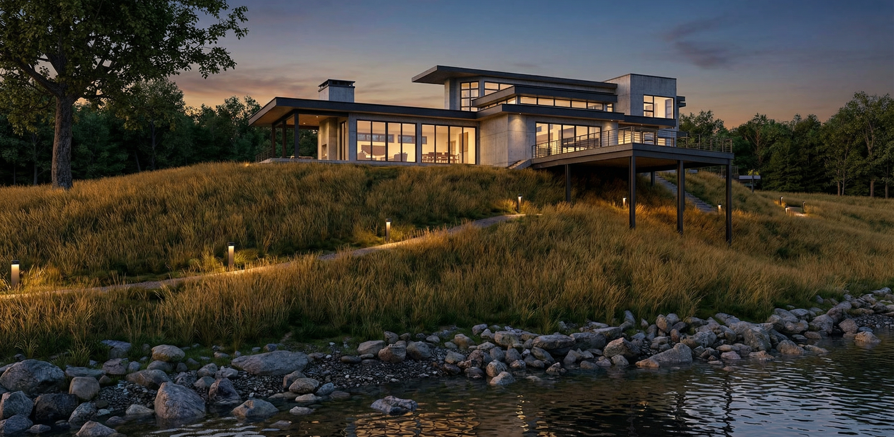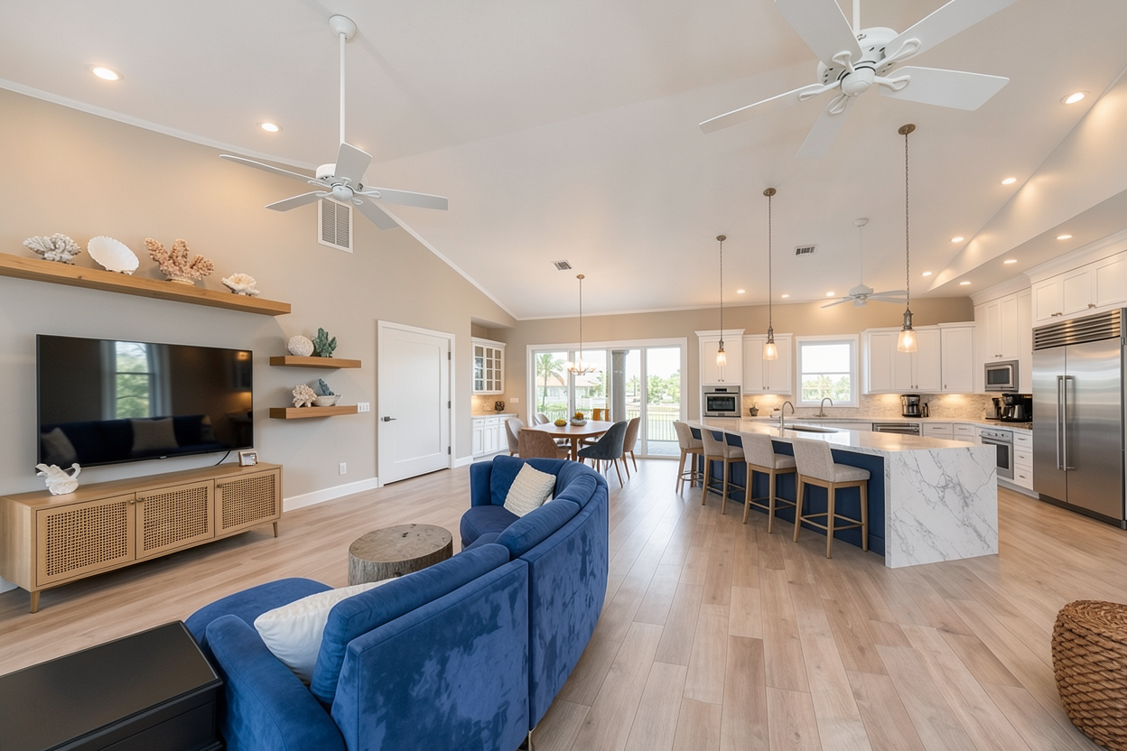 you are a professional image renderer you create the highest grade renderings around and specialize in architectural renderings this is the front elevation of a house create a high resolution photorealistic image of this structure keep the windows as they are where they are keep the doors as they are where they are keep the main structure as it is where it is feel free to change the perspective keep the roofline as it is where is it do not add anything to the structure that i have not asked for the roof is metal the siding is metal the chimney is white brick the front door will be wood the background will be tropical florida it should be early afternoon with a bright sunny day clear skies the landscaping should be late spring with an abundance of color and should be that of a luxury estate