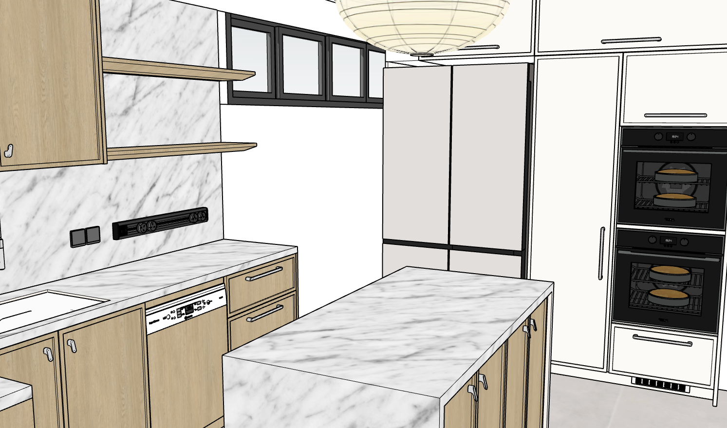 lights turned on spotlight on ceiling glossy carrara marble counter top and backsplash matt white fridge door panels remove handles on fridge door panels led strip light