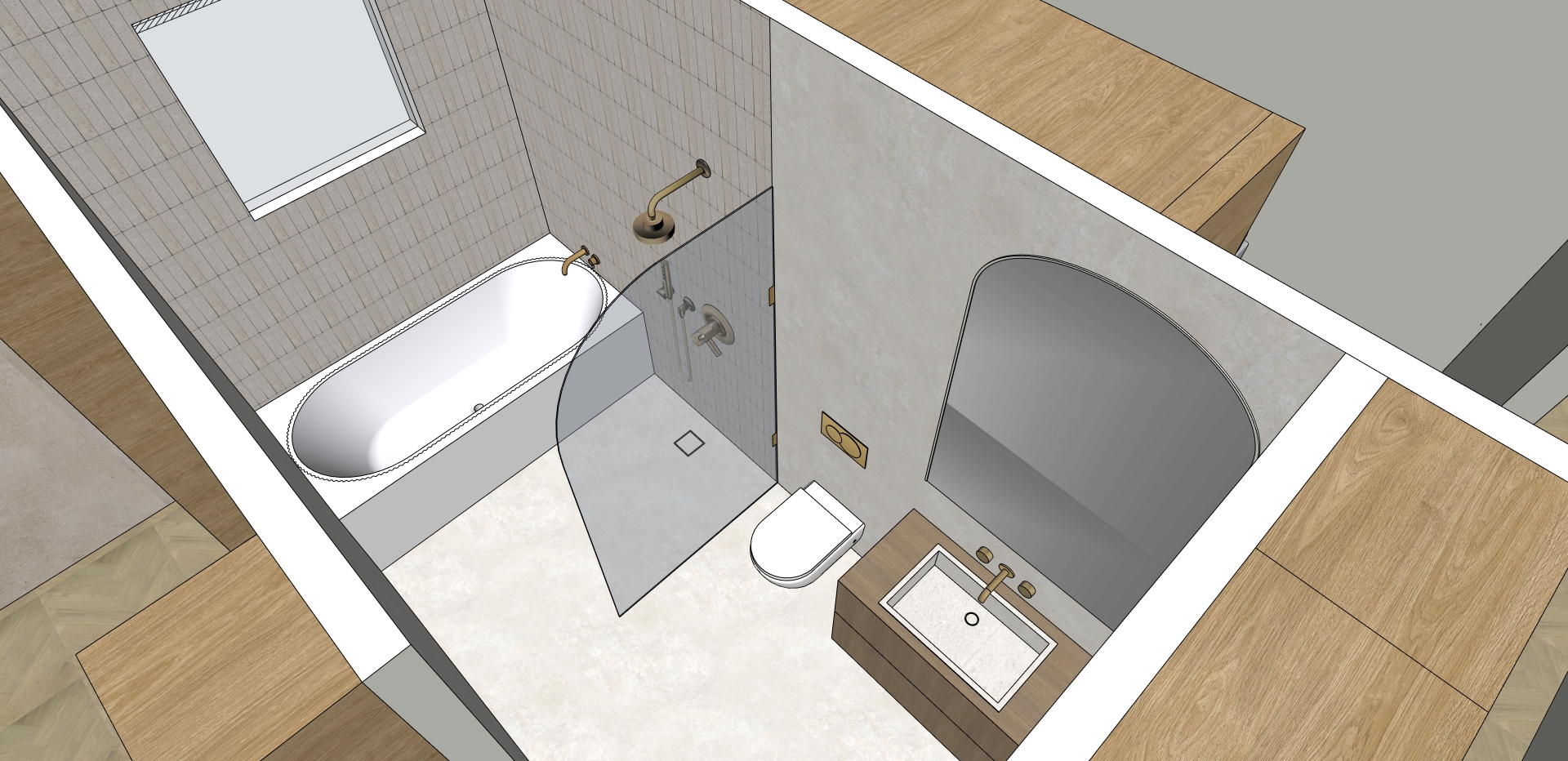 use the uploaded 3d image as the source of truth for all geometry layout objects materials and textures primary goal adjust the camera perspective only to match the reference images and capture the entire bathroom in a single realistic shot camera composition reframe the view into a clean two point perspective ensure the following are all visible in one cohesive angle vanity toilet shower bathtub maintain correct proportions no distortion or warping keep vertical lines straight and realistic architectural accuracy aim for a natural interior photography composition geometry materials preserve all geometry exactly as in the 3d image do not move resize or redesign any objects keep all materials textures and finishes identical no additions or removals of elements lighting introduce natural light coming from the window above the bathtub lighting should feel soft and realistic daylight add subtle natural shadows no harsh contrast ensure even illumination across the space mirror keep mirror geometry unchanged add soft backlighting to the mirror clean subtle glow no change to mirror size or placement style output realistic architectural render soft natural finish balanced exposure not overexposed or too dark clean minimal and easy to read visually strict rules do not change layout geometry or object placement do not redesign materials or textures do not add new objects or features only adjust camera perspective and lighting as specified