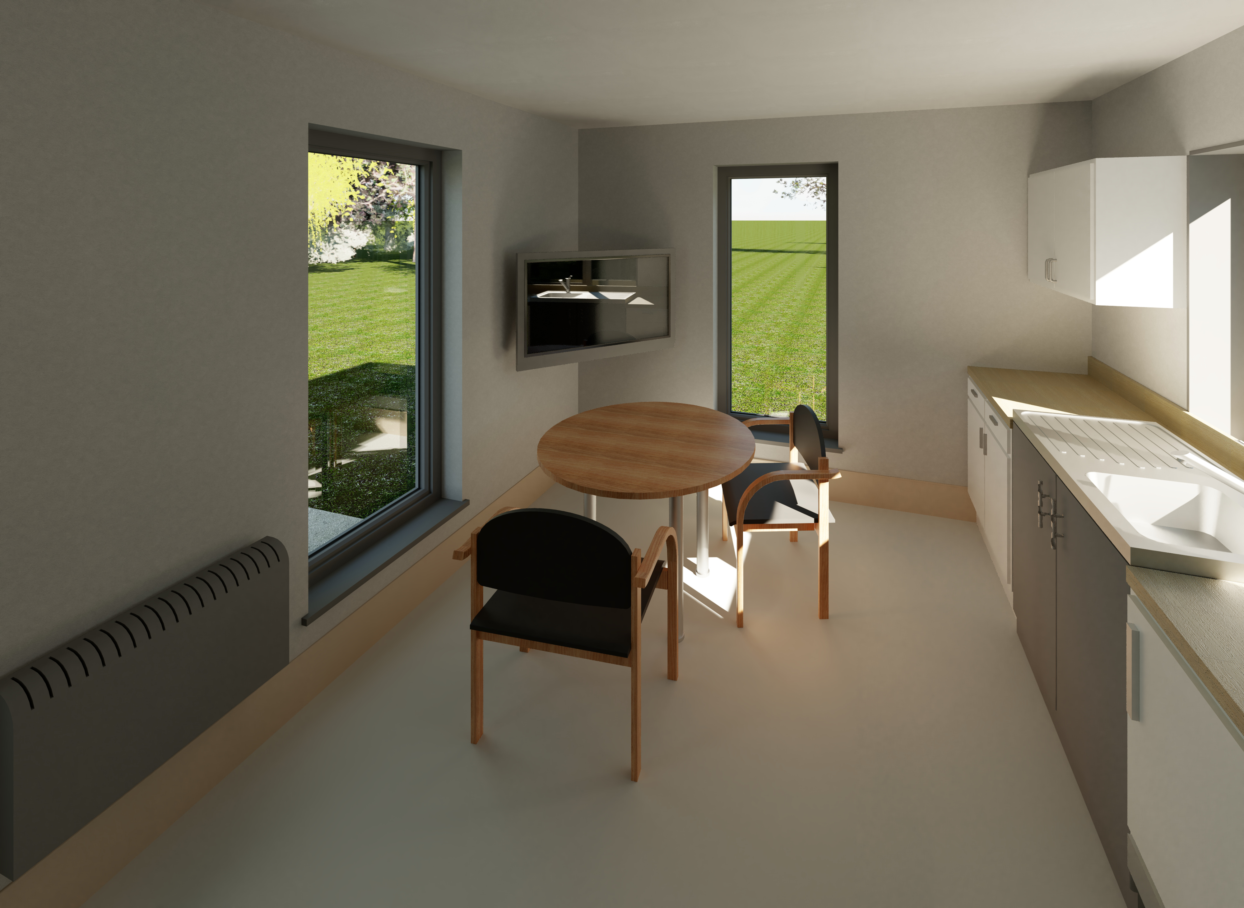 modernist interior shot cozy modern cabin exterior surrounded by lush greenery vertical wooden panels in light oak dark gray trim and roof large windows with soft reflections welcoming front door in warm walnut sleek metal ramp in brushed aluminum overcast sky casting a gentle diffused light creating a serene and peaceful atmosphere grass in rich deep green architecture