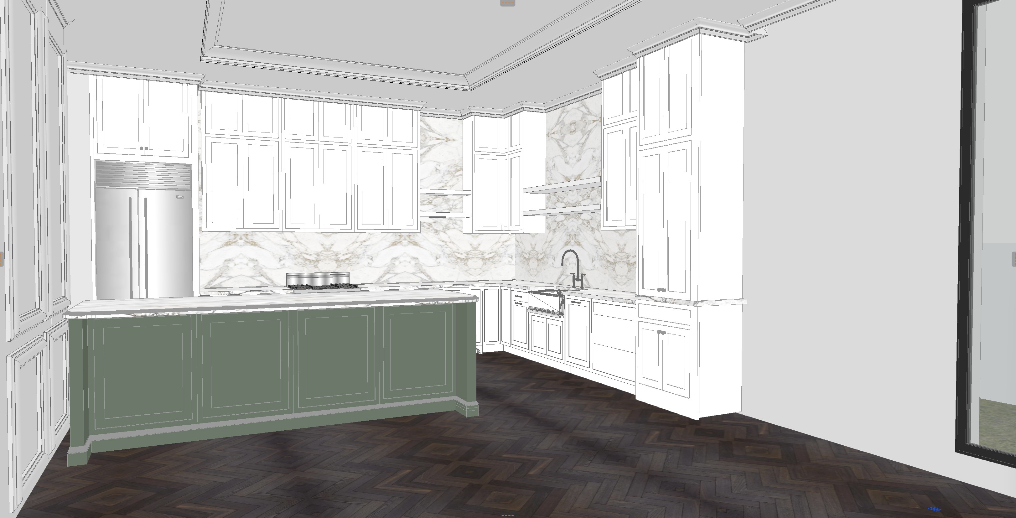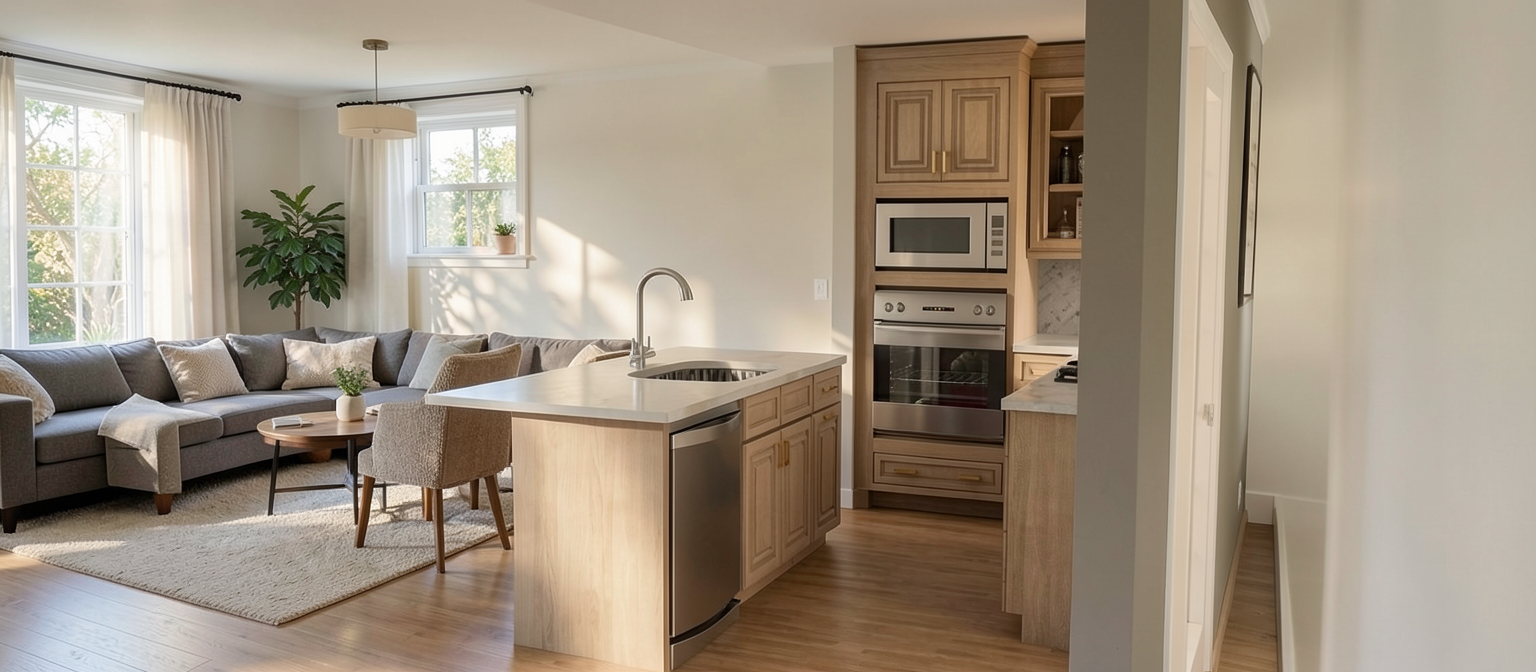 warm white kitchen with a light white oak range hood marble countertops on a sunny day