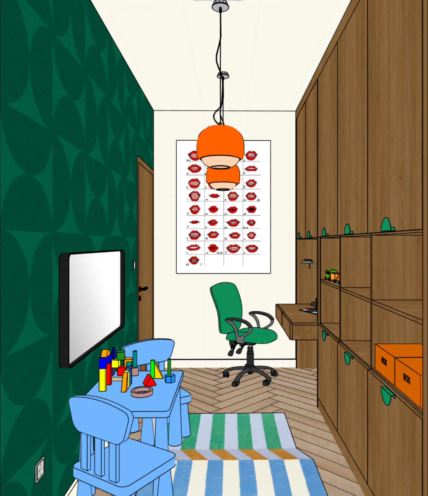 retro style room with bright colors ikea begripa cabinet handles and ikea mammut child chairs and table mirror low on the left wall anda light blue frame 70s plastic pendant lights emmit a warm glow bright daylight is pouring in from the huge window behind the camera lots of toys