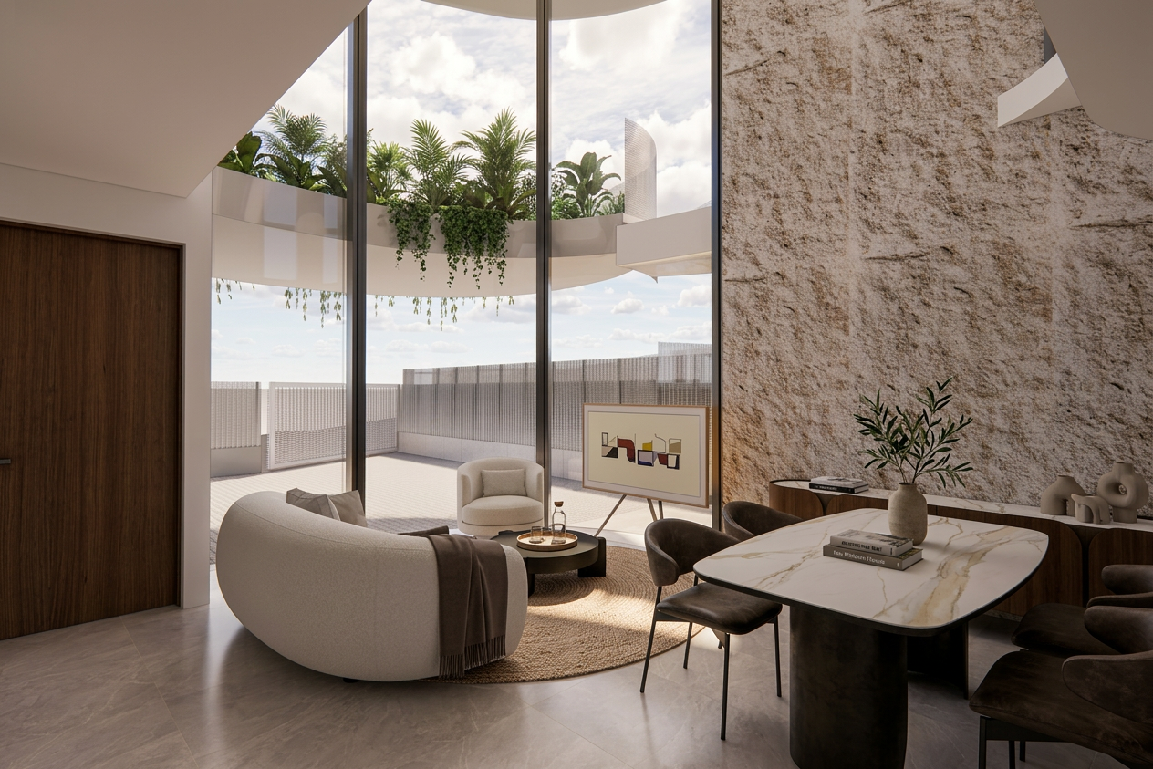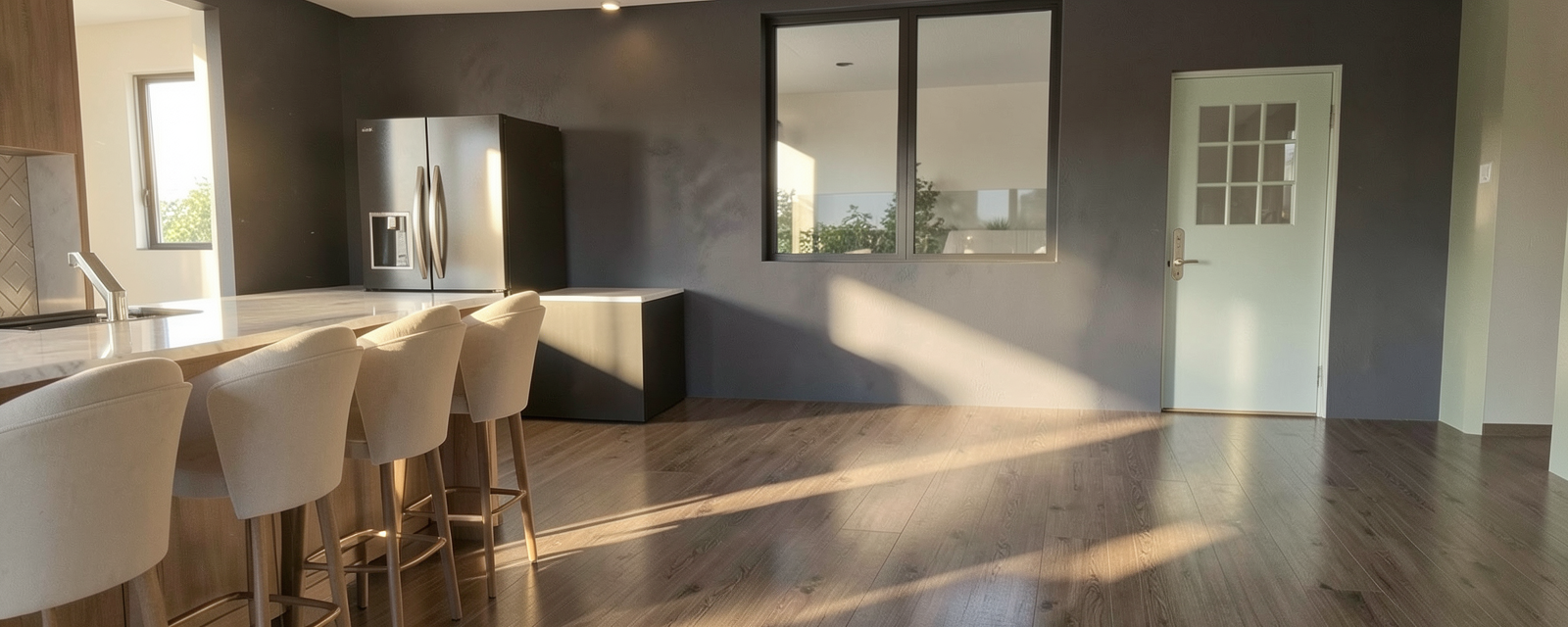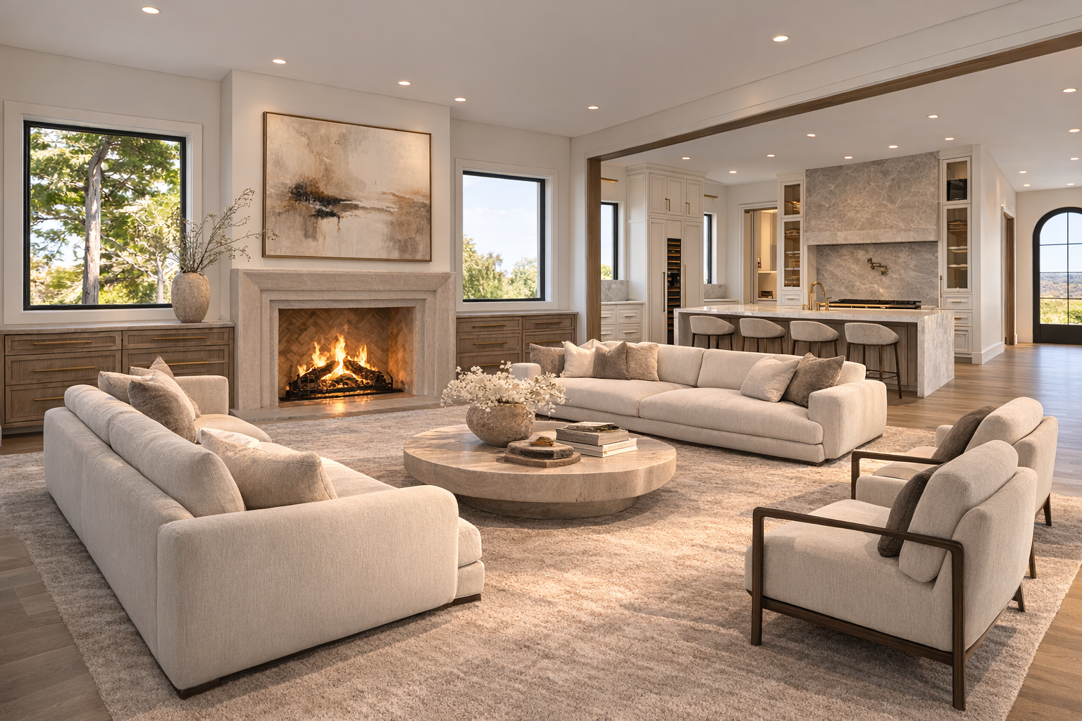 convert this architectural rendering into a highly realistic editorial style luxury real estate photograph suitable for marketing and listing imagery maintain the exact architecture layout geometry cabinetry layout window placement and proportions exactly as modeled do not redesign restyle or modify the architecture or cabinetry do not move or adjust cabinets appliances islands windows or walls enhance realism only through natural lighting accurate material texture subtle reflections and soft shadow depth the image should feel like a professionally photographed architectural digest style interior used for luxury real estate marketing materials in the space include builddirect engineered wide plank flooring in seashore finish walls and ceiling painted origami white by sherwin williams cabinetry featuring a combination of white painted cabinets and natural stained wood cabinets countertops and backsplash in taj mahal quartzite with soft slightly warm tones the wood flooring should show authentic grain correct plank scale subtle tonal variation and a natural matte sheen the natural stained wood cabinetry should show realistic wood grain depth natural variation and refined craftsmanship white cabinetry should appear clean crisp and softly illuminated with natural shadow lines at the doors and panel details the taj mahal quartzite counters and backsplash should appear natural and refined with soft movement and subtle warm tonal variation not overly glossy or artificial natural light should be softly entering through the windows in an editorial architectural photography style creating gentle highlights natural interior bounce light and subtle shadow depth throughout the space the furniture and decor shown in the rendering should be treated as placeholders and replaced with high end restoration hardware and pottery barn style staging elements appropriate for a luxury kitchen inside the glass upper cabinets add very minimal restoration hardware style styling only a few carefully placed objects should be visible such as a small stack of neutral ceramic plates a few simple glassware pieces one refined serving object the glass cabinets should remain mostly open and uncluttered maintaining a clean high end appearance add subtle kitchen staging elements such as a neutral stone or ceramic bowl a refined serving tray or board a small stack of curated cookbooks all staging should remain restrained and minimal so the architecture and cabinetry remain the focus the final image should appear highly realistic refined and editorial similar to a luxury architectural digest feature or professionally photographed high end listing do not alter architecture cabinetry layout appliances materials geometry or design only enhance realism and staging