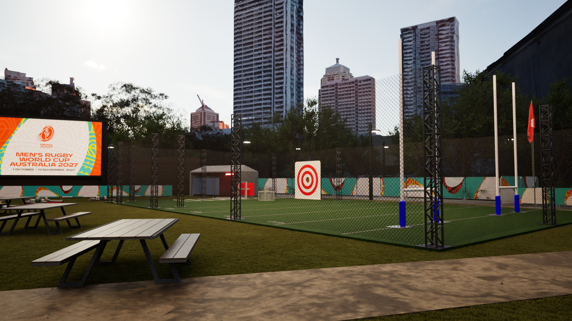 show kids playing on the sports field make the people 1 6m high include people sitting at the table food and beers make the background a warm sunny day