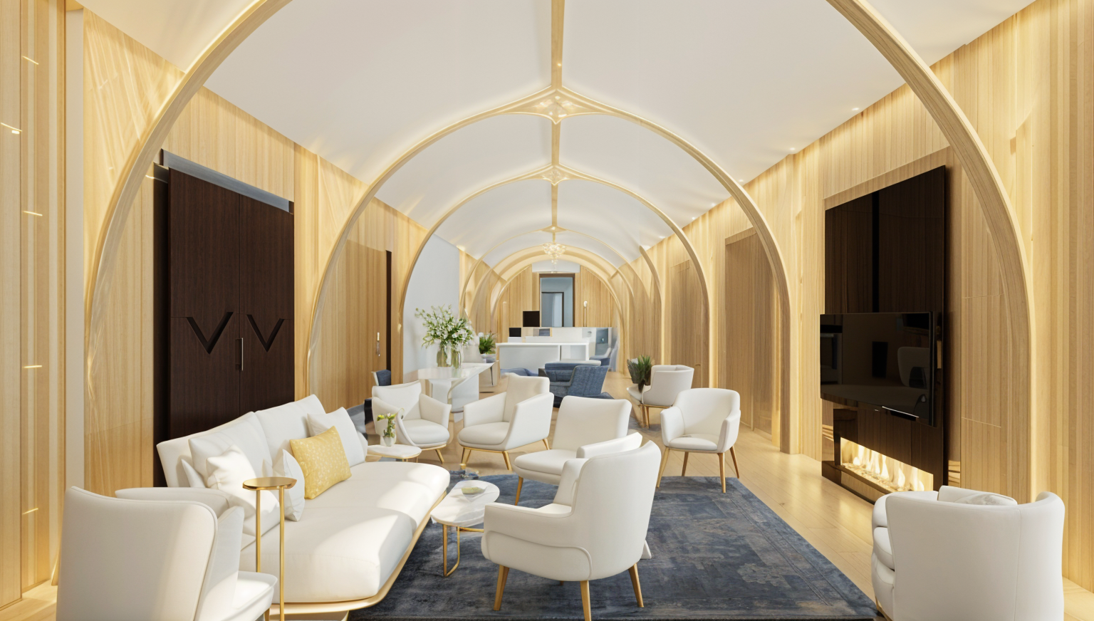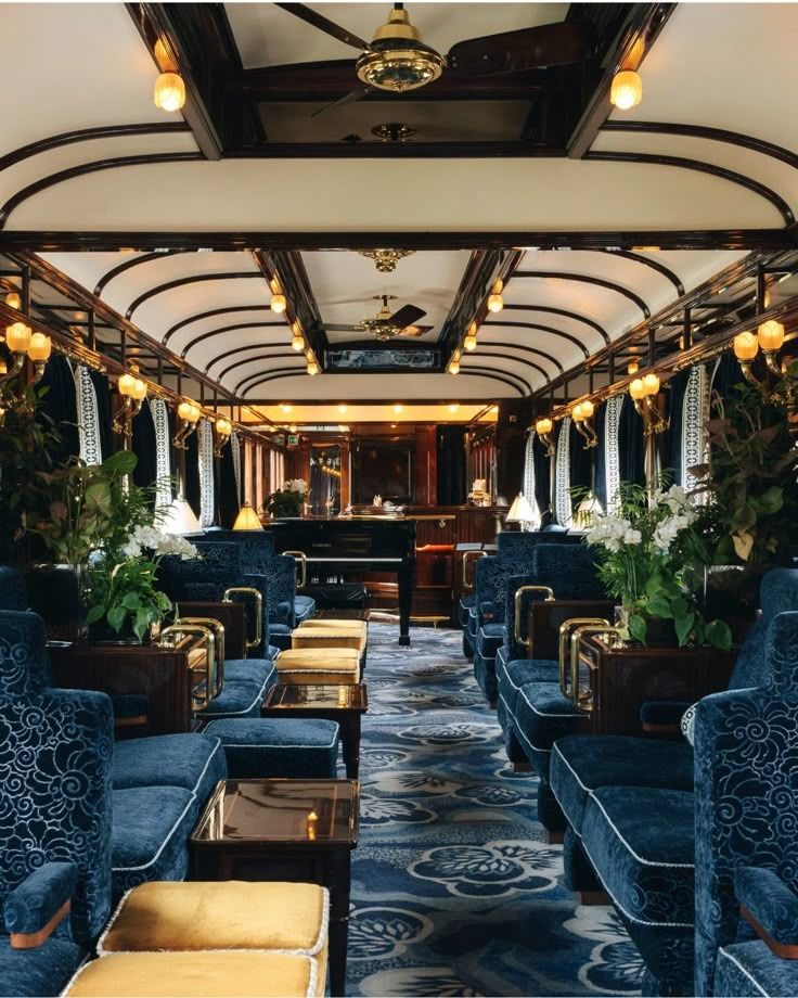 interior shot thai contemporary style train interior shot luxurious a combination of wood and blue color outside window should be landscape view