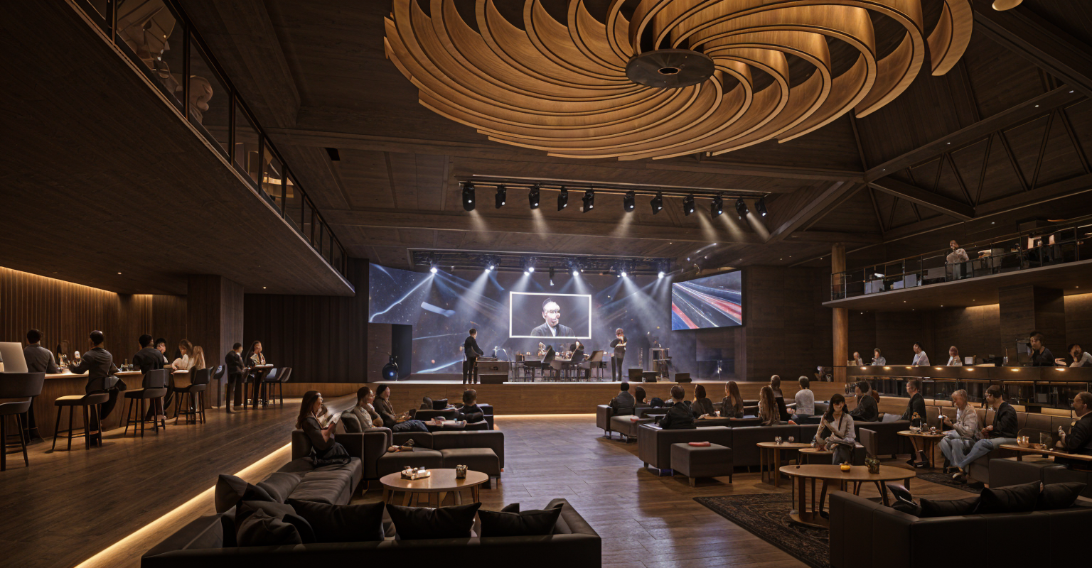richard rogers wide angle shot convert this stage and interior into a photoreal upscale nightclub in use at night keep the architecture and proportions exactly as shown exposed steel truss system balcony geometry and railing ceiling height stage height and shape wood stage fascia rigging positions and the large spiral wooden ceiling centerpiece do not change the geometry or add new structures curtains plants signage or decor add balanced warm ambient architectural lighting so the room is clearly visible add cove lighting along balcony edges and architectural lines uplight the spiral wooden ceiling feature so it becomes a focal point stage lighting rigs remain active and realistic with controlled beams and light haze not overpowering the room upgrade the seating to a more luxurious and upscale lounge environment place larger more comfortable lounge groupings with premium materials such as tufted leather rich velvet dark wood tables and brushed metal details arrange the seating logically and oriented toward the stage increase the number of patrons fill the space with a denser affluent audience seated in the lounge areas and standing in appropriate locations everyone must face the stage and pay attention to the performers engaged and focused no one distracted taking photos or looking away density should feel lively and active but not overcrowded or chaotic the single led wall behind the performers must show one unified abstract motion background suitable for a live show the background must be consistent across the entire wall not a collage no logos no text no photographs no recognizable imagery integrate a simulated picture in picture imag camera feed within the led wall content as a clean rectangular overlay that looks like part of the led processor signal no separate screens tvs or monitors anywhere in the room the led wall is the only display surface use a polished concrete floor with soft reflections keep the existing camera angle and composition final mood is premium modern exclusive full of energy and ready for a live performance architecture