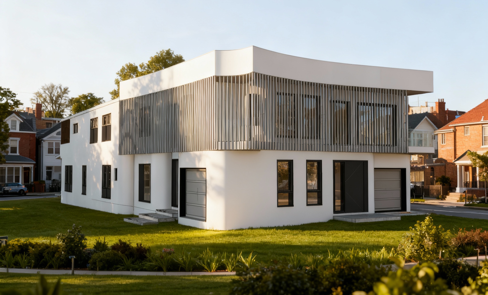 contemporary house with white rendered walls and white screen with black garage door sits in urban neighbourhood with house around with a park at the front of the house