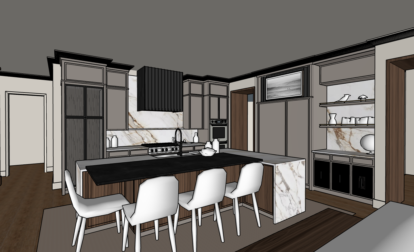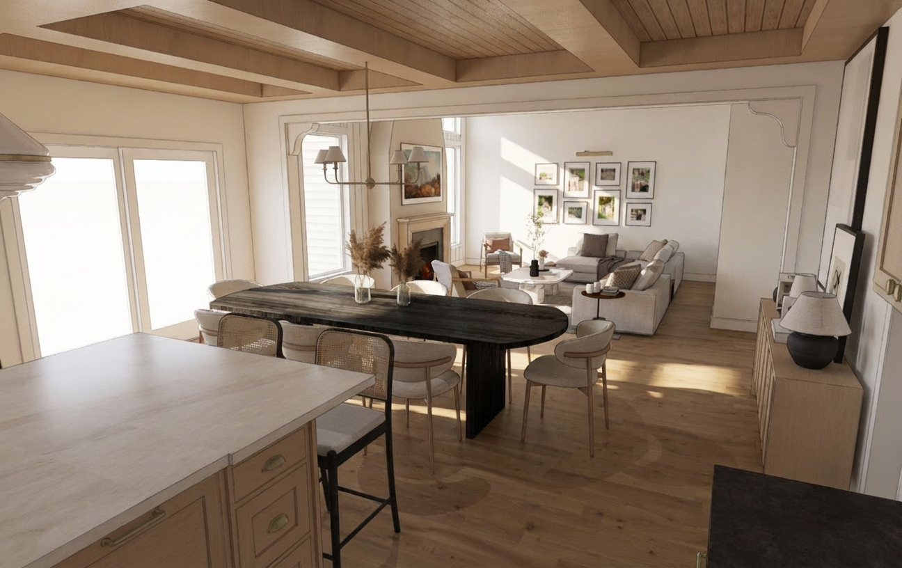 hyper realistic architectural photography high end interior design luxury transitional home kitchen maintain the existing layout scale architectural details and camera perspective do not alter ceiling height window placement or overall room proportions design custom millwork throughout the space some painted naturel by sherwin williams with a warm natural finish all millwork hardware to be dark bronze for a cohesive elevated look within the millwork maintain proper scale and symmetry within the millwork layout trim above the millwork to be painted to match whatever is below it for a seamless transition and clean architectural recessed can lighting and add soft natural sunlight entering from the windows casting light across the floor and extending acrossf the room with realistic shadows and highlights create realistic highlights and shadows that enhance all textures ensure the overall aesthetic feels high end and cohesive with a balanced contrast between warm light oak textured wallcovering and brass accents the space should feel tailored sophisticated and softly illuminated realistic textures 8k resolution highly detailed shot on phase one xf global illumination raytraced reflections clean minimalist aesthetic